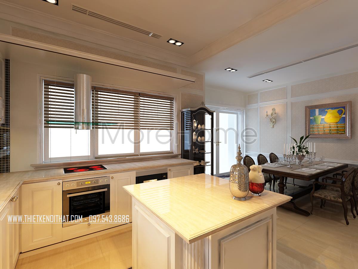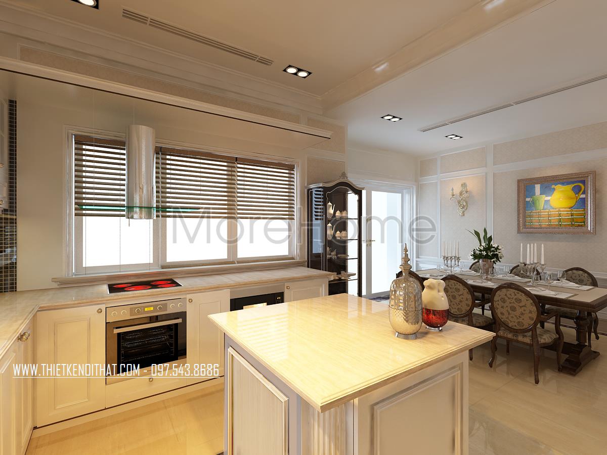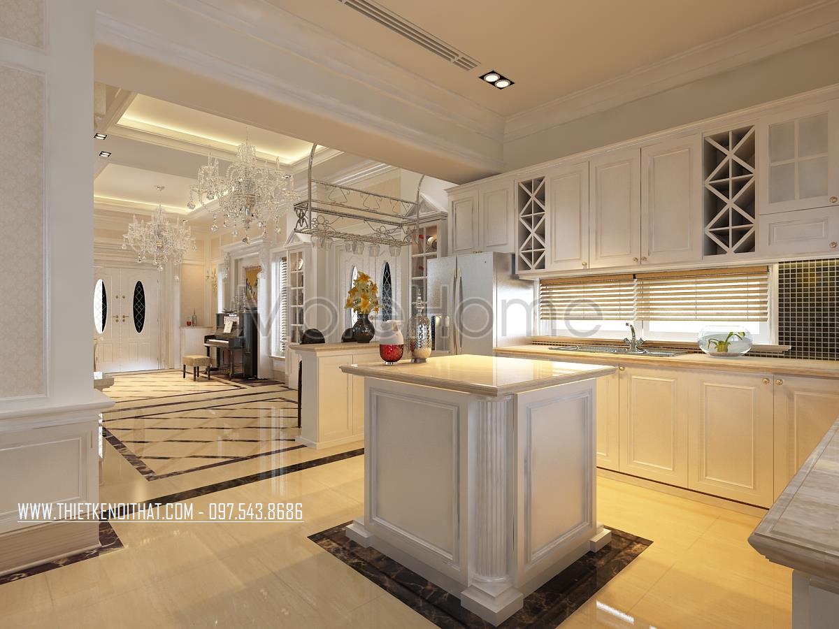 Thiết kế nội thất phòng bếp tân cổ điển được đặt liền kề với phòng khách, không hề có vách ngăn từ đó tạo không gian kết nối liền mạch giúp mở rộng tầm nhìn cho gia chủ. Tone màu sáng trắng được kiến trúc gia và gia chủ lựa chọn làm tone màu chủ đạo của khu bếp mang lại cảm giác sạch sẽ và thành thoát cho không gian.