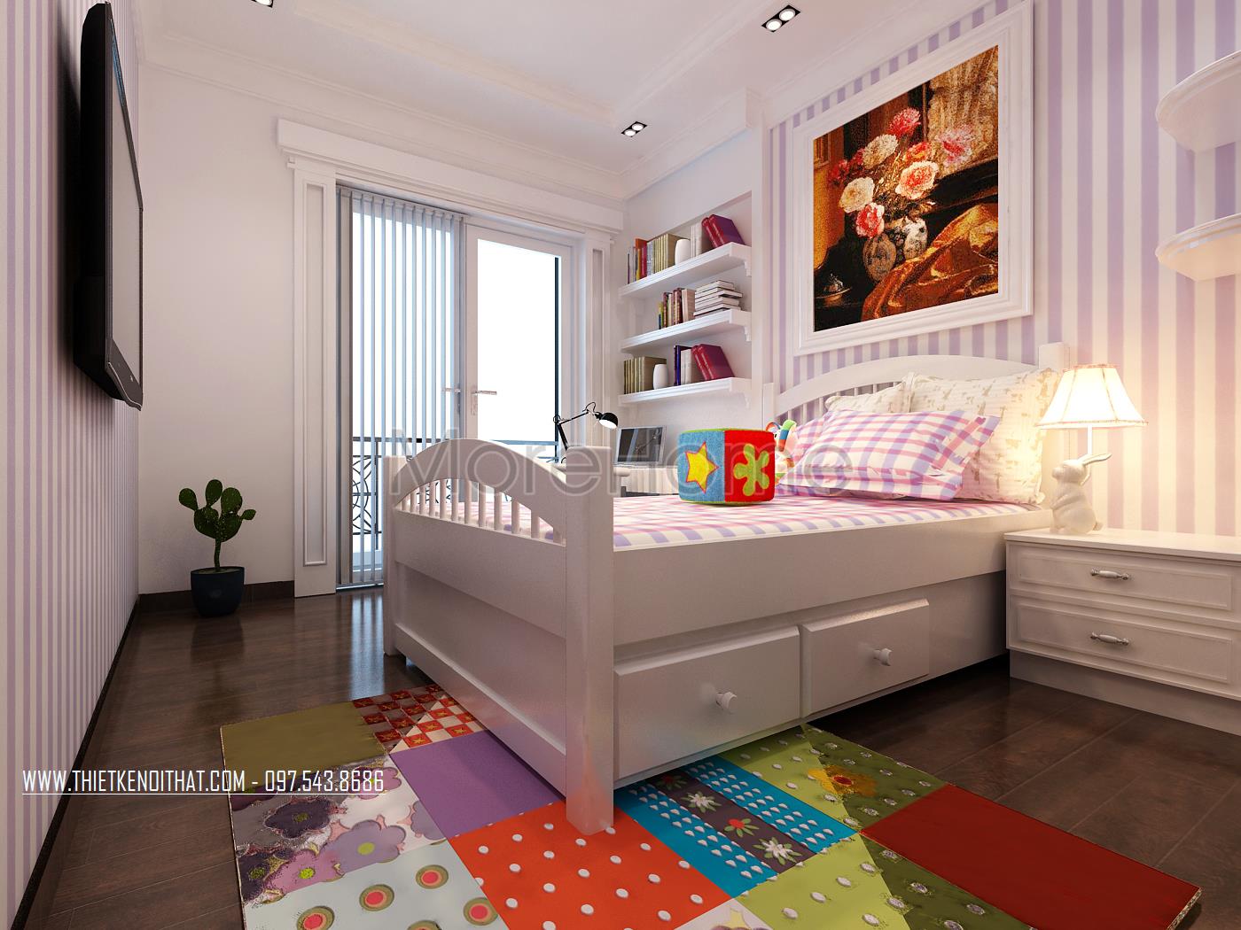 Thiết kế nội thất Vinhomes Riverside phòng ngủ cho trẻ sử dụng tone màu xanh navy điểm xuyết gợi trí tò mò cho gia chủ. Thiết kế giường ngủ kết hợp tủ đựng đồ là một ý tưởng khá hay vừa đảm bảo tiết kiệm diện tích lại tăng tính công năng cho sản phẩm. Hai khung cửa sổ đối xứng giúp mang lại ánh sáng tự nhiên, sức sống cho căn phòng. Ngoài ra, thiết kế tủ kệ chính là điểm nhấn của không gian này, không quá cầu kỳ nhưng đủ để tạo ấn tượng nhờ sự kết hợp khéo léo, sáng tạo.