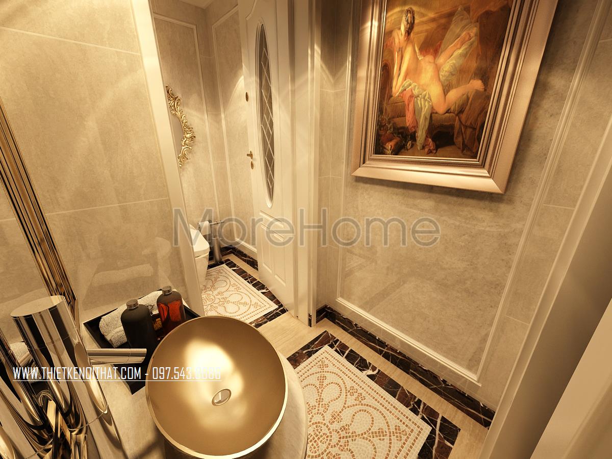 Cuối cùng là không gian nhà vệ sinh sang trọng. Màu sắc và ánh sáng chính là hai yếu tố nổi bật nhất ở thiết kế này. Tone màu ánh kim kết hợp với ánh sáng tự nhiên tạo nên một không gian thiết kế hoàn hảo mang đến sự sang trọng cho không gian phòng. Tuy không tốn quá nhiều diện tích thiết kế nhưng các vật dụng sử dụng và sắp xếp hợp lý, kính cường lực trong suốt tránh độ bí cho không gian đã giúp cho gia chủ cảm thấy thoải mái và tự nhiên nhất.