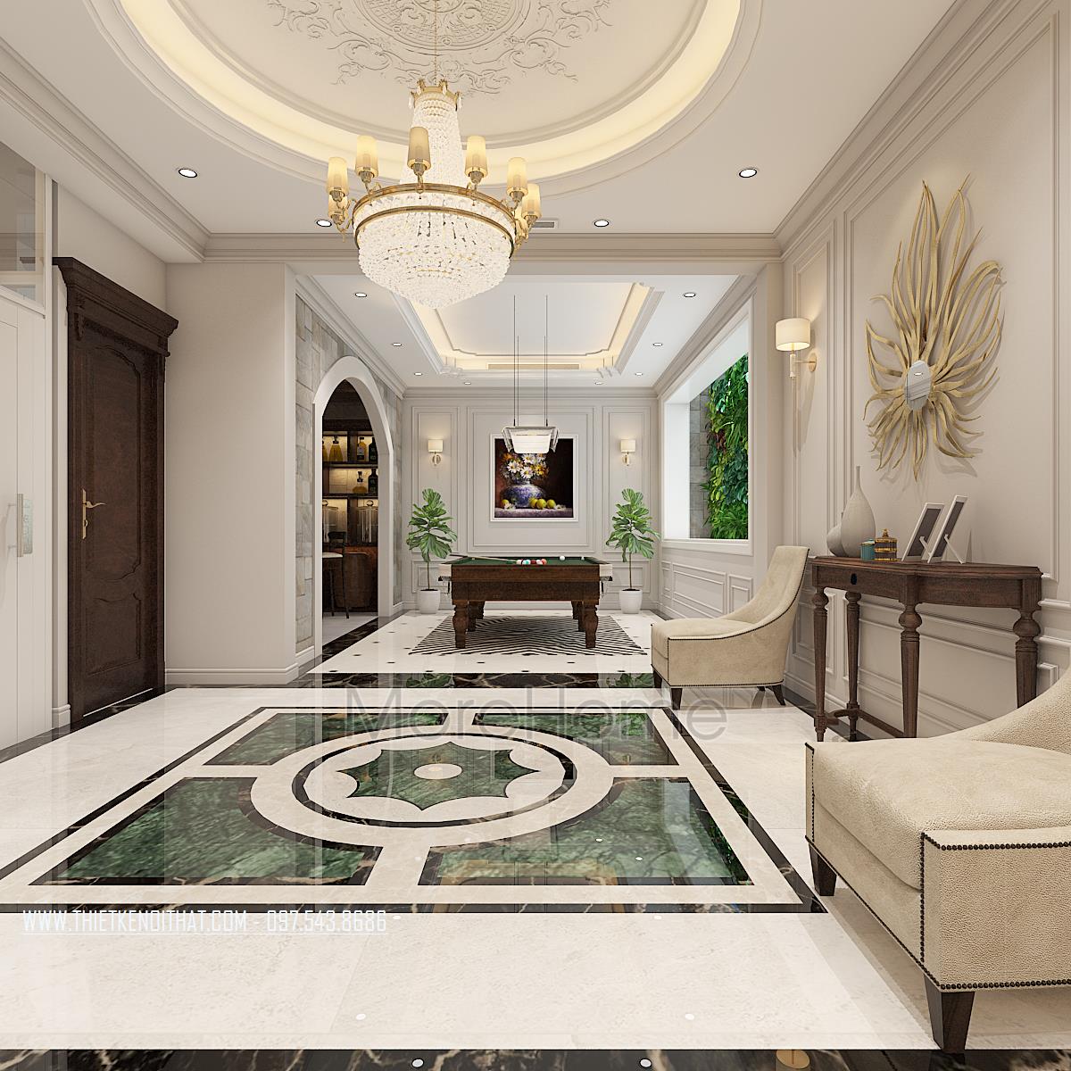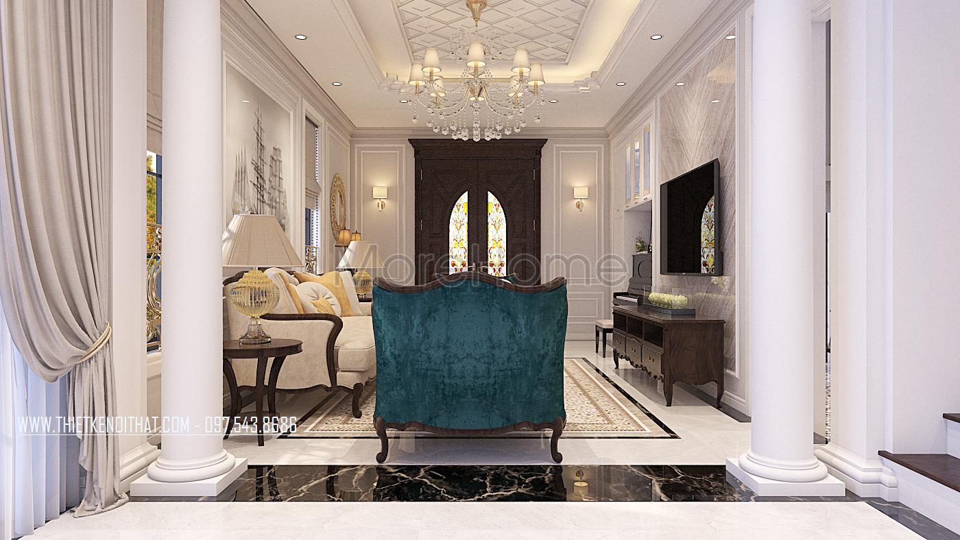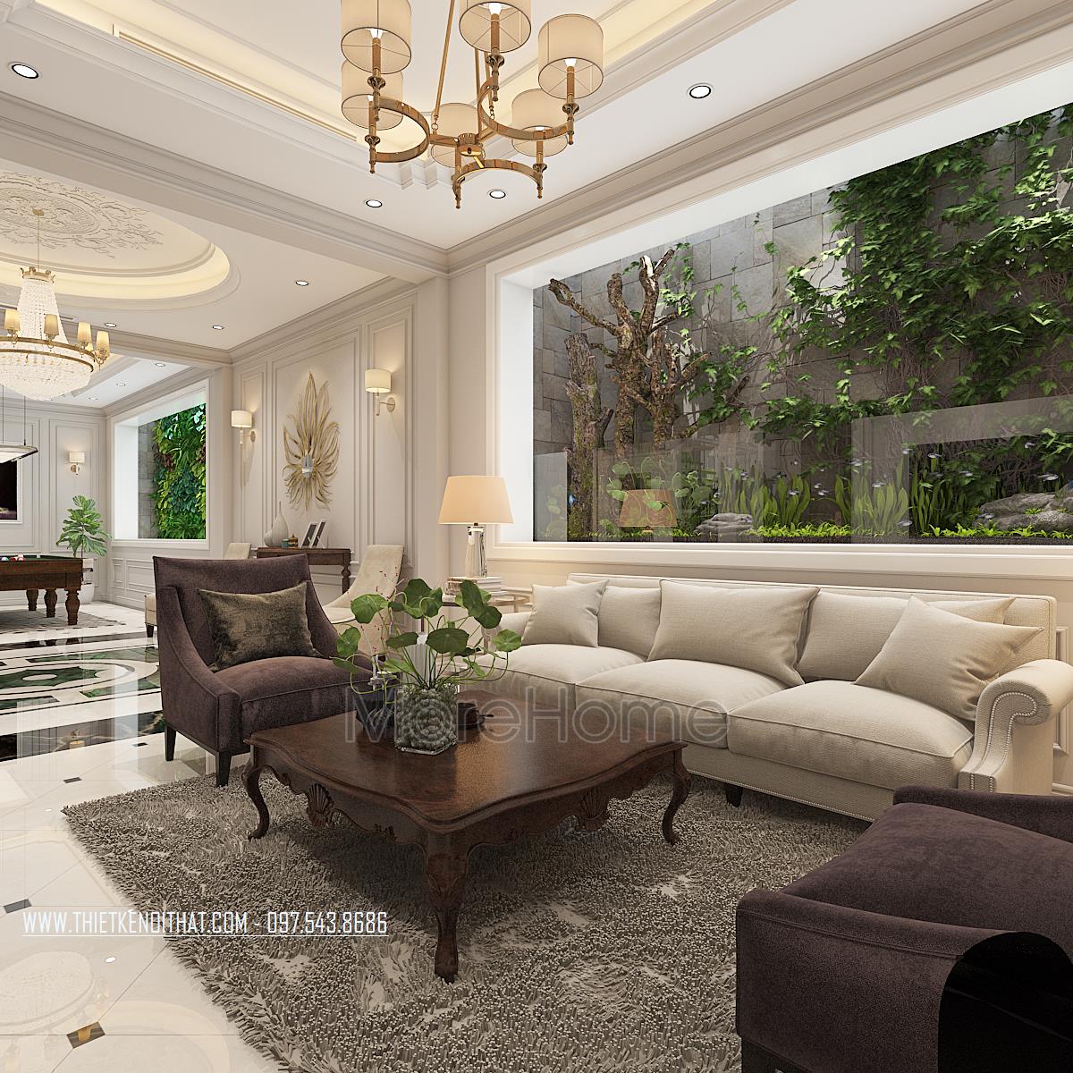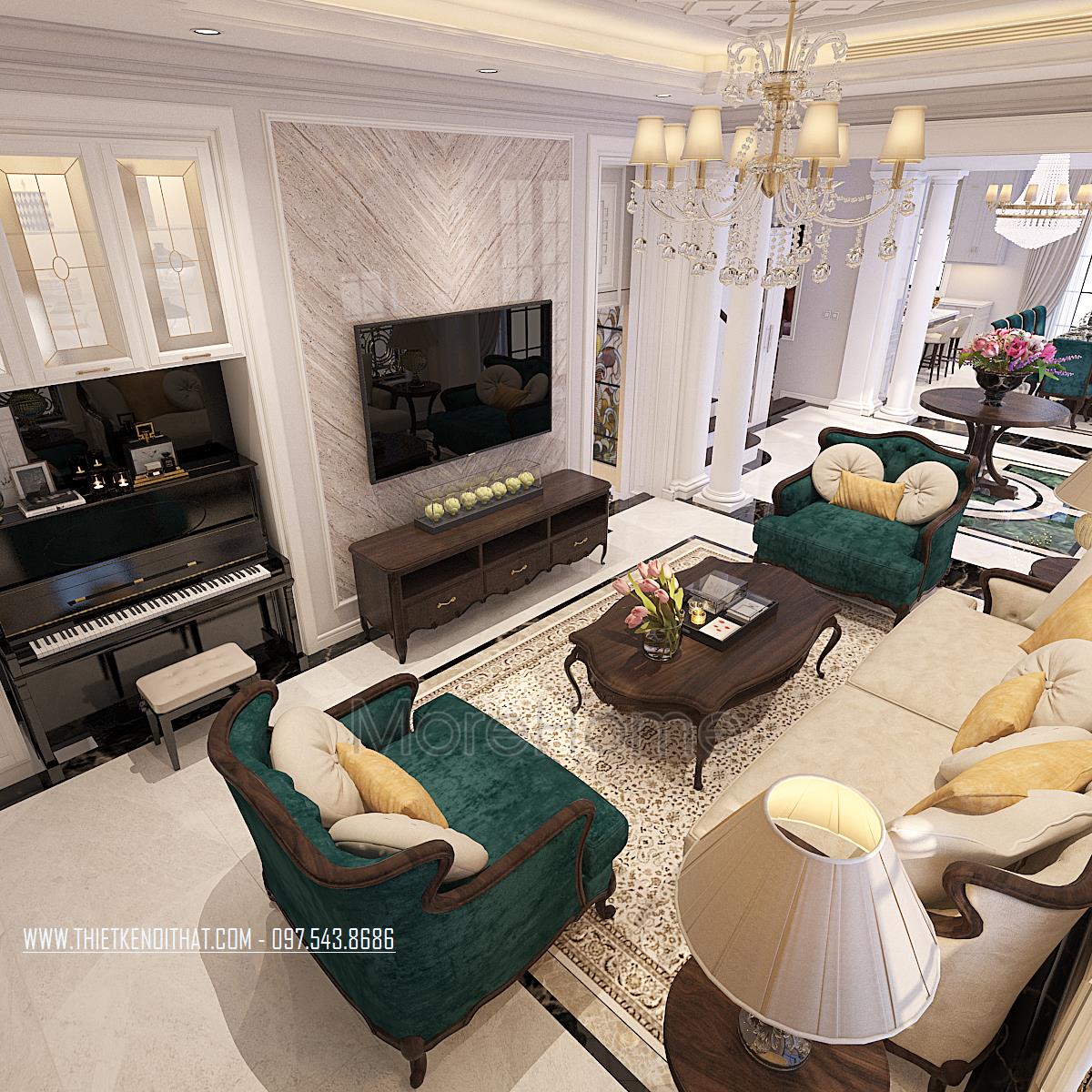 Thiết kế nội thất biệt thự phong cách tân cổ điển thuộc khu tổ hợp cao cấp Vinhomes Riverside là một trong những căn hộ nổi bật với đặc điểm kiến trúc riêng, khắc học được rõ sở thích và cá tính của gia chủ. Ngay từ thiết kế nội thất phòng khách kiến trúc sư đã gây ấn tượng bởi các đường nét và chi tiết tỉ mỉ, tinh tế. Thiết kế ghế sofa được kiến trúc sư lựa chọn có kích cỡ khá rộng rãi, tone màu xanh coba cổ điển kết hợp với sắc trắng tinh khổi cũng là điểm đặc biệt thu hút. Thay vì việc sử dụng các đường thẳng hay các khối hình rõ ràng như thiết kế nội thất phong cách hiện đại, chúng ta có thể dễ dàng nhận ra kiến trúc sư sử dụng rất nhiều đường cong hay chi tiết trạm khắc cầu kỳ ngay từ các chi tiết nhỏ như ghế sofa, đèn bàn, bàn nước, hay gối tựa,…