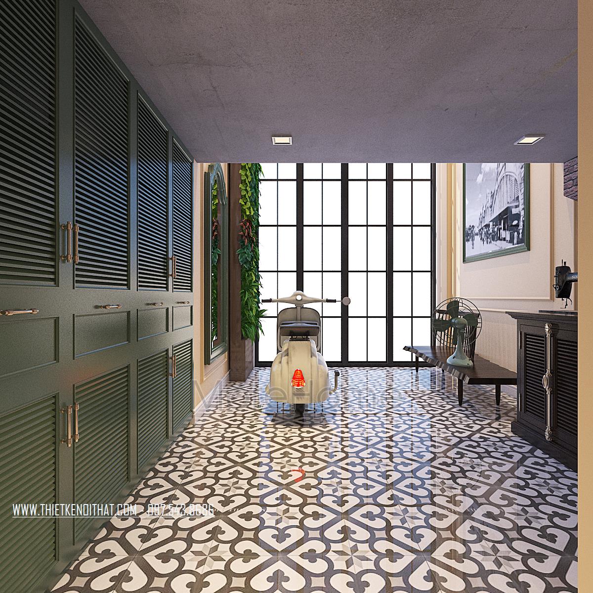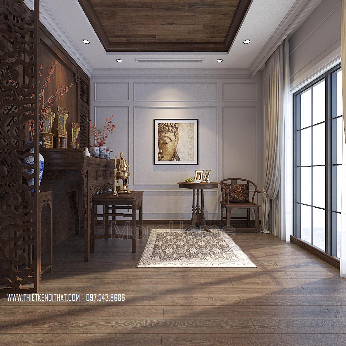 Một khu vực phòng riêng rộng rãi được sử dụng làm không gian linh thiêng thờ cúng. Thiết kế gỗ tự nhiên được ưu ái hơn cả giúp mang đến sự thoải mái và yên bình cho không gian thờ cúng. Bên cạnh đó, các yếu tố phong thủy tâm linh cũng được tuân theo mang lại sự bình tâm trong gia chủ. Các bức vách gỗ với hoa văn tinh xảo hay tranh treo tường góp phần lớn thể hiện tính thẩm mỹ cho không gian này.