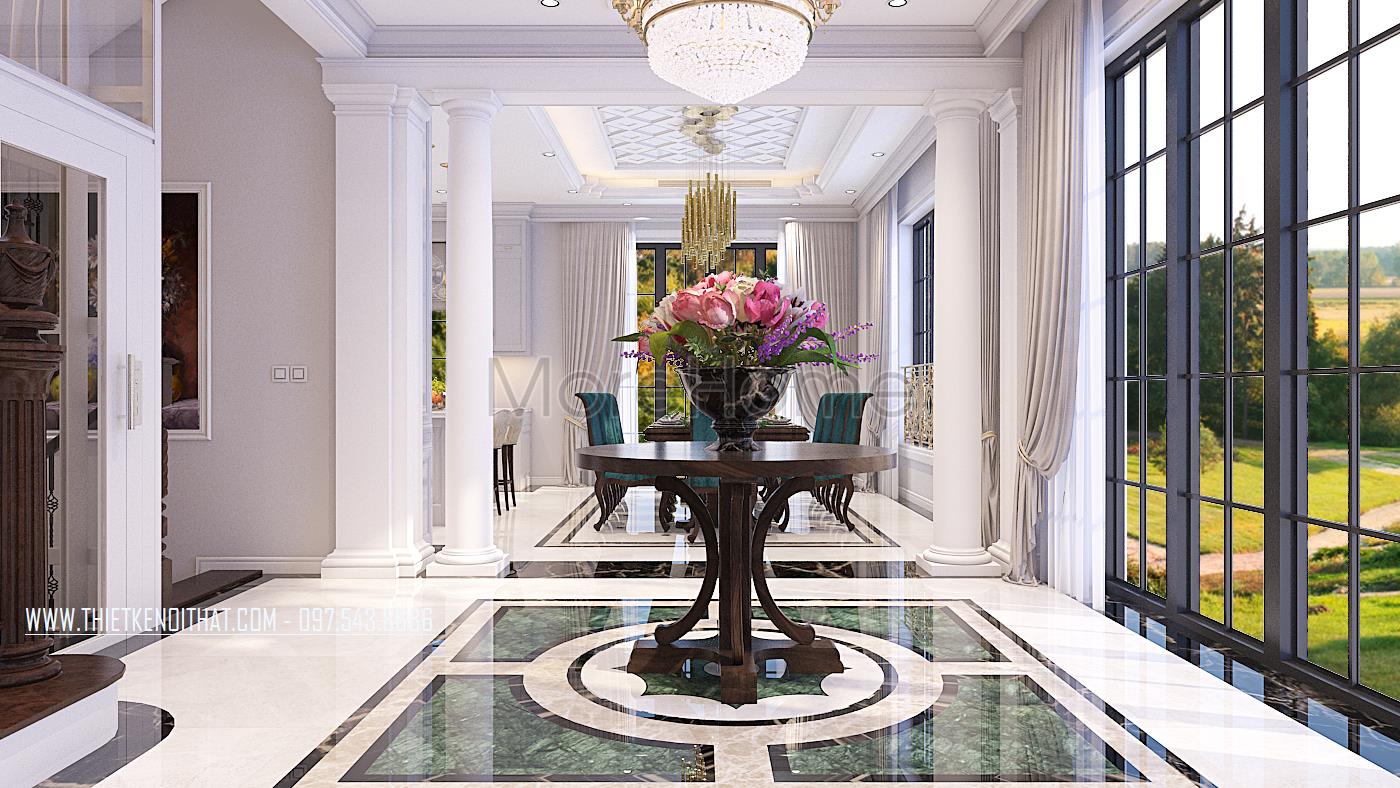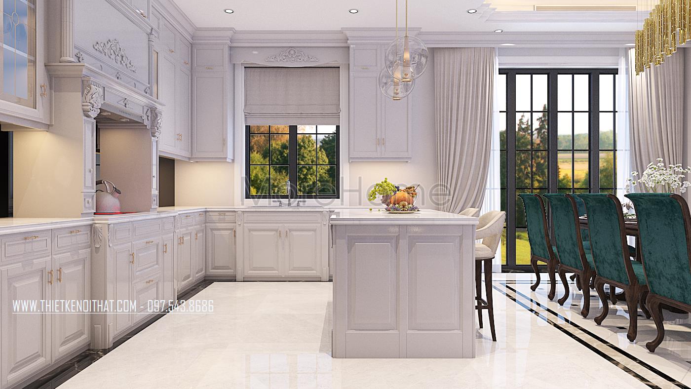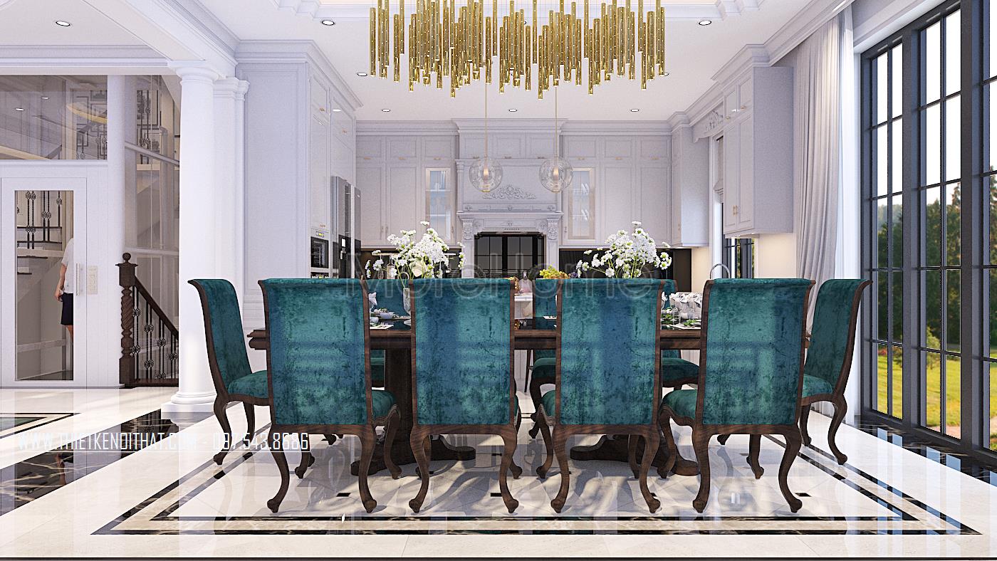 Tiếp theo là thiết kế nội thất bàn ăn và bếp liền kề. Không gian sinh hoạt chung sử dụng khá nhiều các cột tròn với chi tiết trạm khắc nhẹ nhàng là một trong những đặc điểm điển hình của phong cách thiết kế nội thất tân cổ điển. Thiết kế bàn ăn lớn và rộng, có tone màu trùng với màu sắc mà kiến trúc sư đã lựa chọn cho thiết kế sofa phòng khách giúp mang đến cảm giác thống nhất cho thiết kế. Bàn ăn lớn với các chi tiết trang trí cong mềm mại theo đúng phong cách tân cổ điển. Các chi tiết khác như đèn chiếu sáng, lọ hoa,… giúp không gian trở nên thu hút hơn.