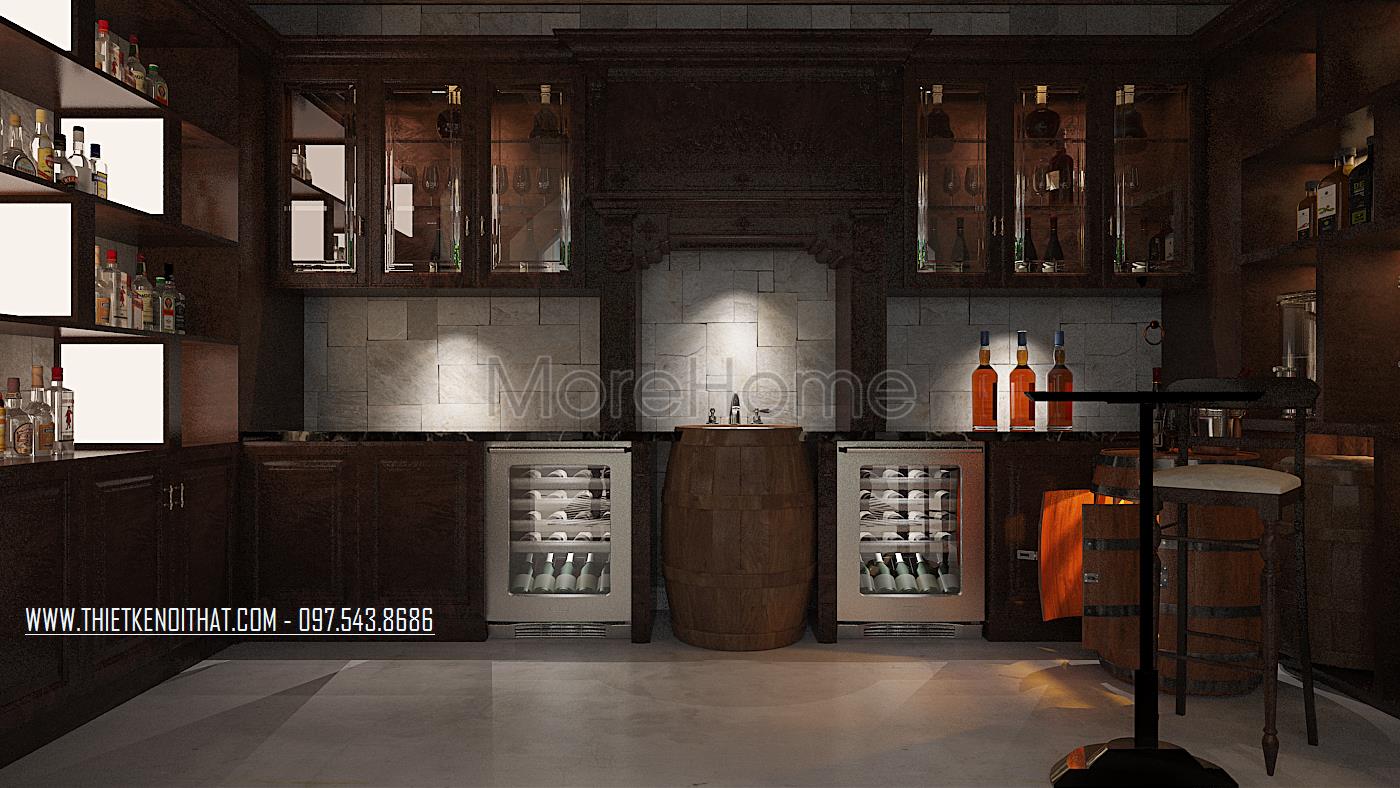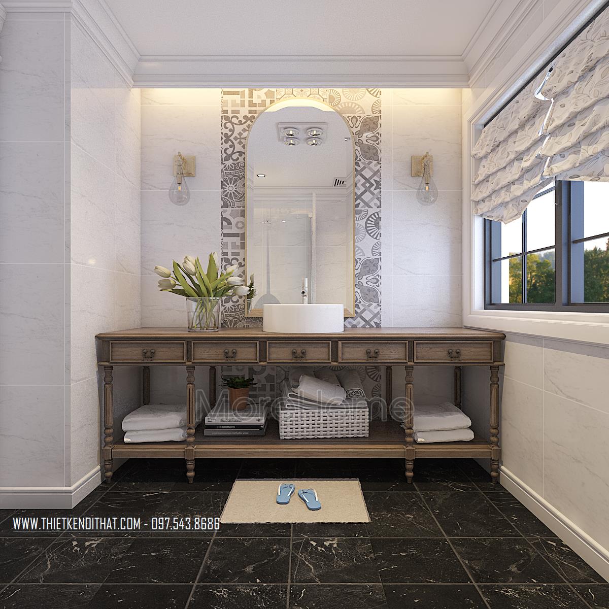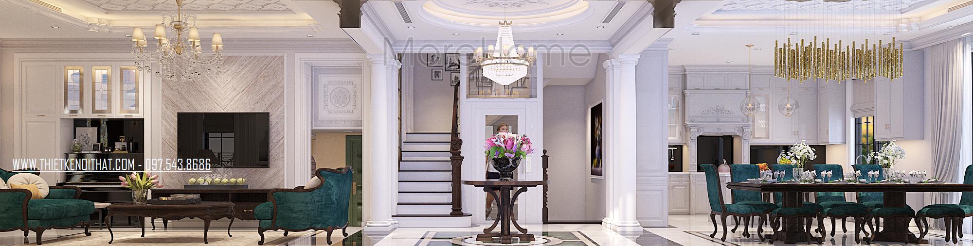 Tiếp theo là thiết kế nội thất bàn ăn và bếp liền kề. Không gian sinh hoạt chung sử dụng khá nhiều các cột tròn với chi tiết trạm khắc nhẹ nhàng là một trong những đặc điểm điển hình của phong cách thiết kế nội thất tân cổ điển. Thiết kế bàn ăn lớn và rộng, có tone màu trùng với màu sắc mà kiến trúc sư đã lựa chọn cho thiết kế sofa phòng khách giúp mang đến cảm giác thống nhất cho thiết kế. Bàn ăn lớn với các chi tiết trang trí cong mềm mại theo đúng phong cách tân cổ điển. Các chi tiết khác như đèn chiếu sáng, lọ hoa,… giúp không gian trở nên thu hút hơn.