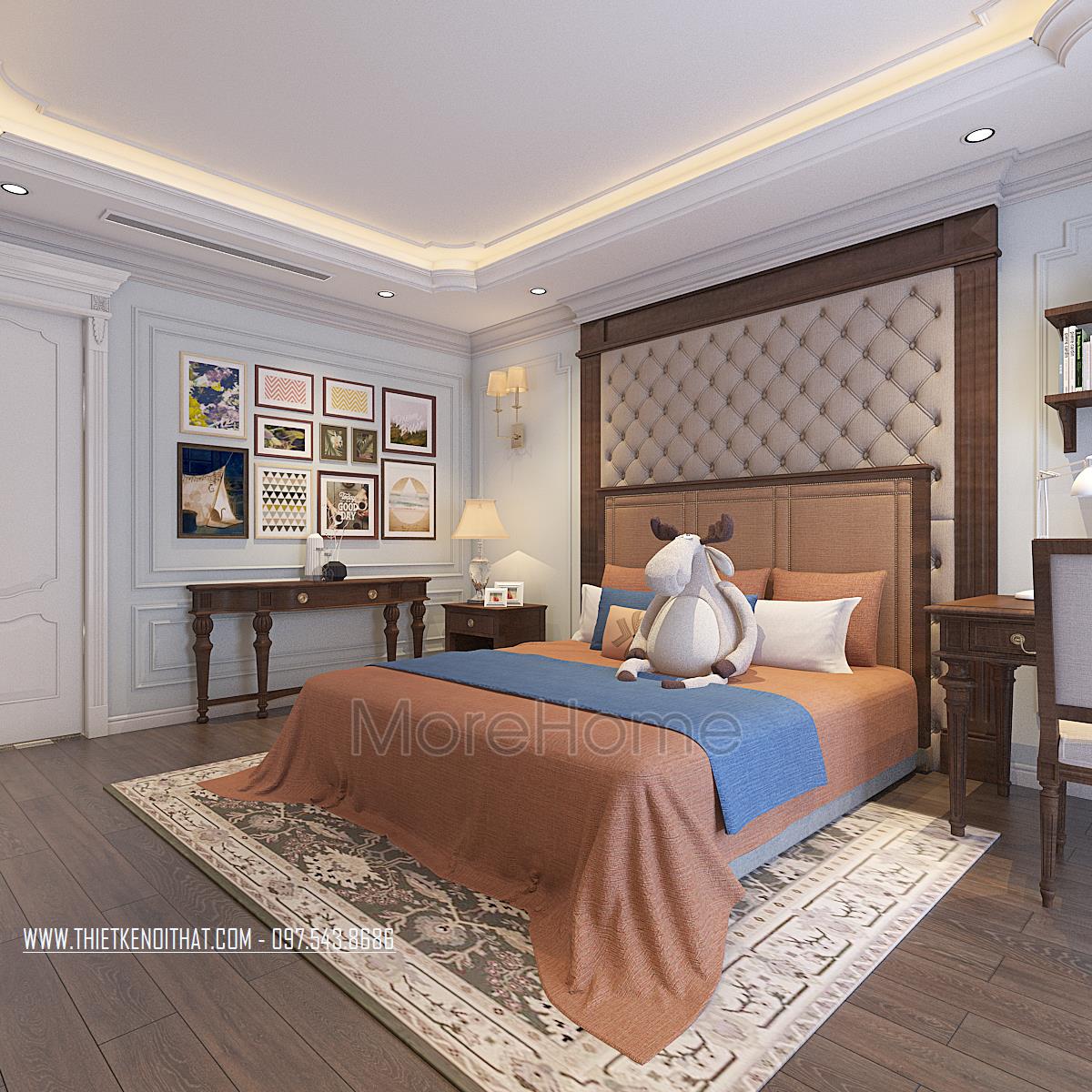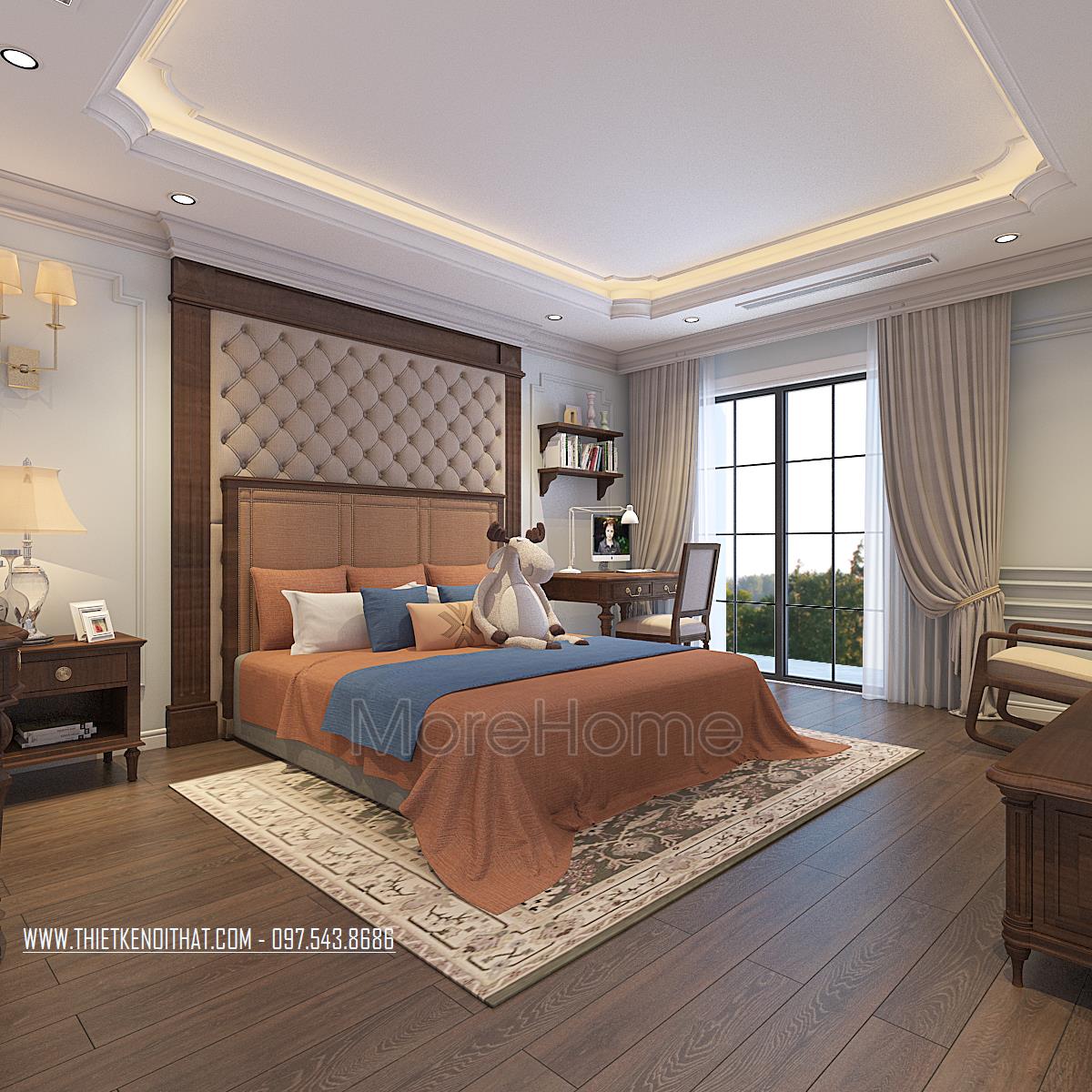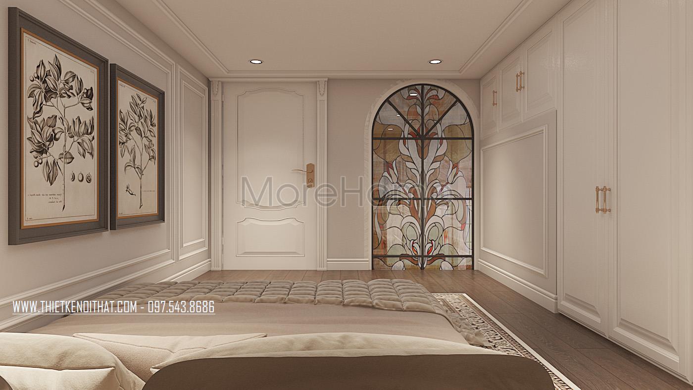 Thiết kế nội thất phòng ngủ phong cách tân cổ điển sử dụng các vật liệu nhẹ như gỗ, kính cường lực làm chủ yếu gợi mở một không gian thiết kế tinh tế, nhẹ nhàng. Ánh sáng tự nhiên được tận dụng từ khung cửa rộng gợi mở một không gian sống tràn đầy sức sống, sự thoải mái và dễ chịu. Thiết kế trang trí giường kệ sử dụng các thanh ngang, dọc làm chủ yếu tuy nhiên vẫn kết hợp các chi tiết trạm khắc ấn tượng, vừa đảm bảo giữ nguyên nét đẹp tân cổ điển lại không làm ảnh hưởng đến diện tích hay mang đến cảm giác nhàm chán cho không gian.