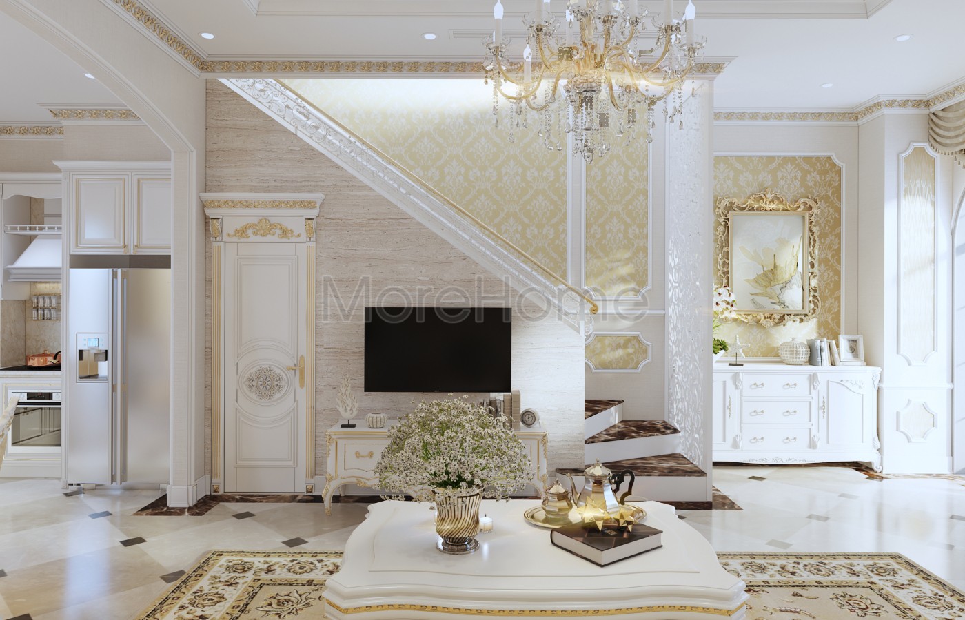 Thiết kế nội thất phòng khách tân cổ điển được kiến trúc sư đầu tư tỉ mỉ về cả đường nét và màu sắc. Các bức tường thô đơn sắc thông thường được thay thế và làm mới bằng thiết kế giấy dán tường ấn tượng. Các hoa văn chìm nhẹ nhàng gợi mở một không gian thiết kế thu hút, tránh cảm giác đơn điệu, nhàm chán từ các bức tường thô đơn giản. Bộ bàn ghế mà kiến trúc sư lựa chọn có tone màu cũng như họa tiết vừa khít, ăn nhập với thiết kế hoa văn trên giấy dán tường, giúp không gian trở nên thống nhất, góp phần định hình thiết kế và phong cách. Các nét trạm khắc nhẹ nhàng trên tay vịn hay bàn gỗ đều trở nên vô cùng cuốn hút. Ngoài ra, các chi tiết trang trí nhỏ khác như thảm trải tràn, tranh treo tường cũng góp phần lớn tăng thêm vẻ đẹp thẩm mỹ cho thiết kế.