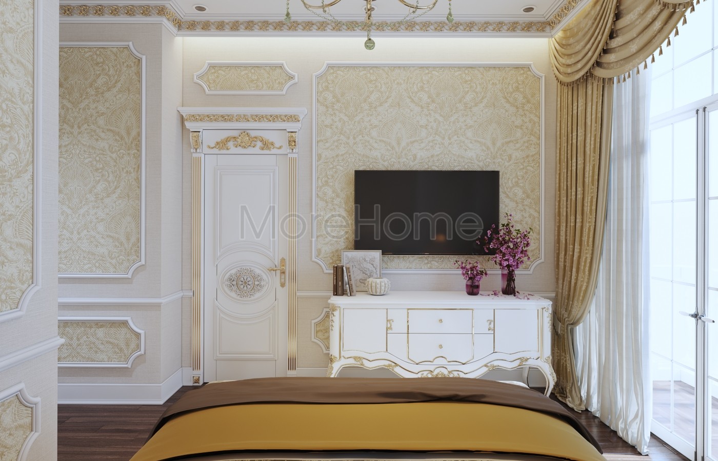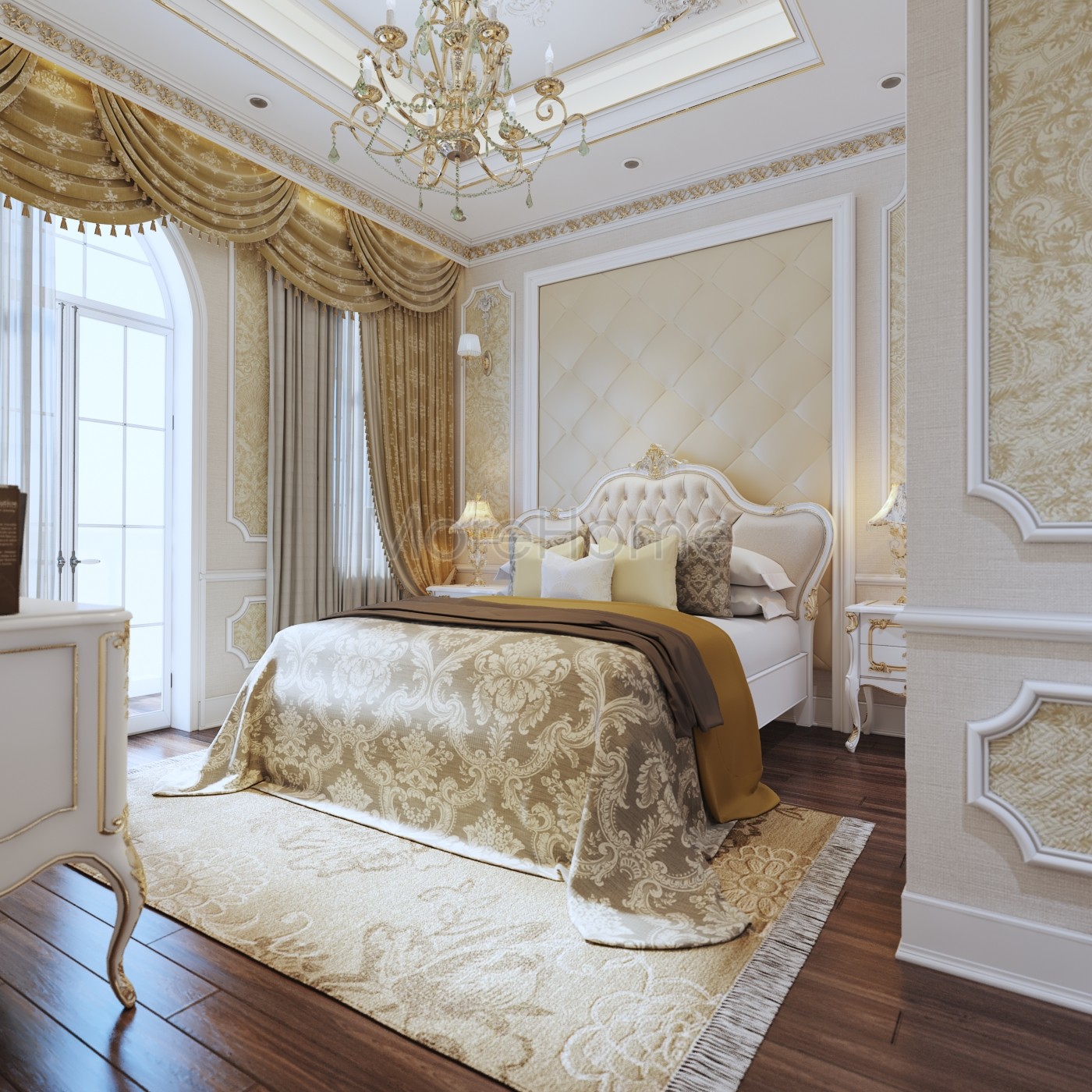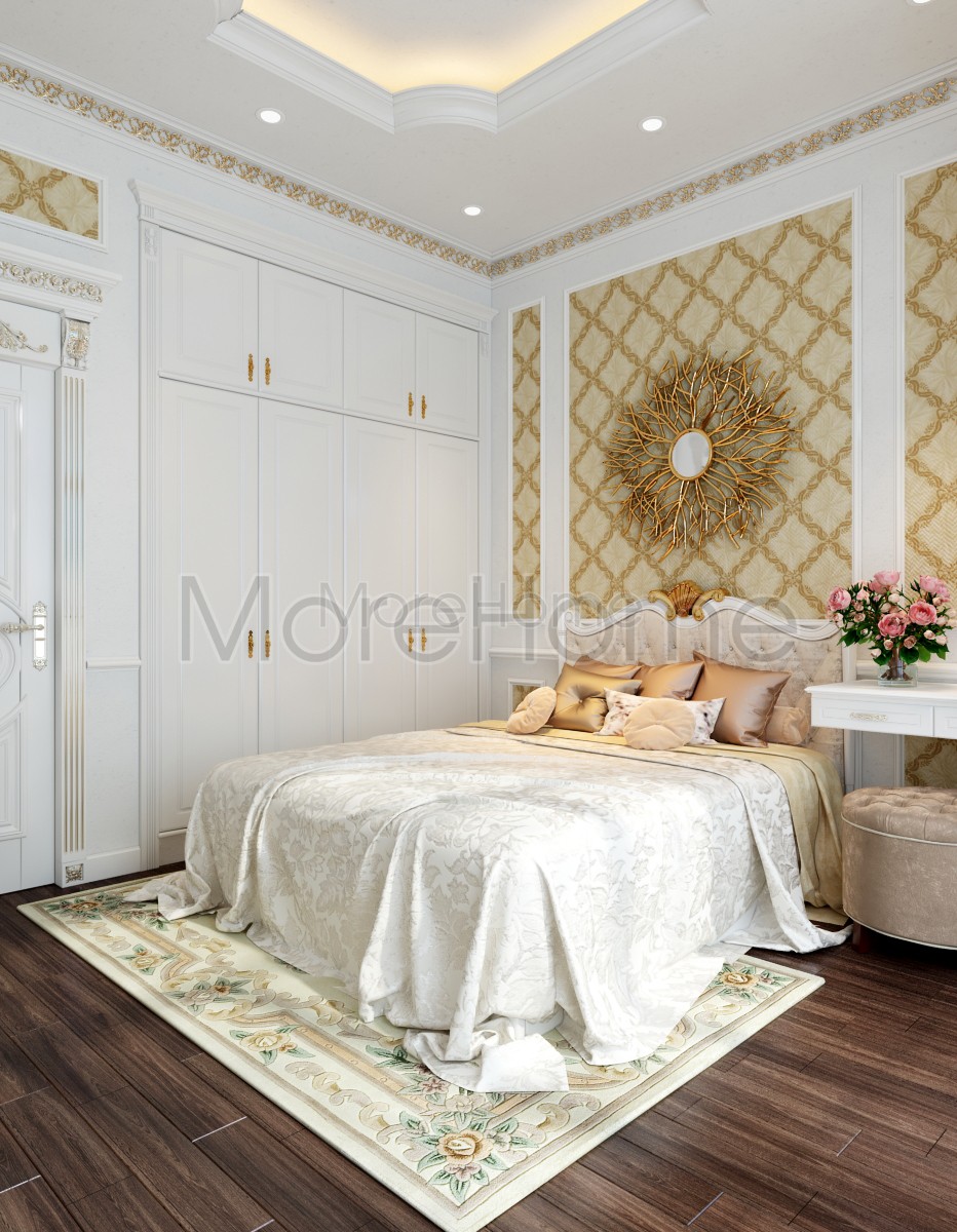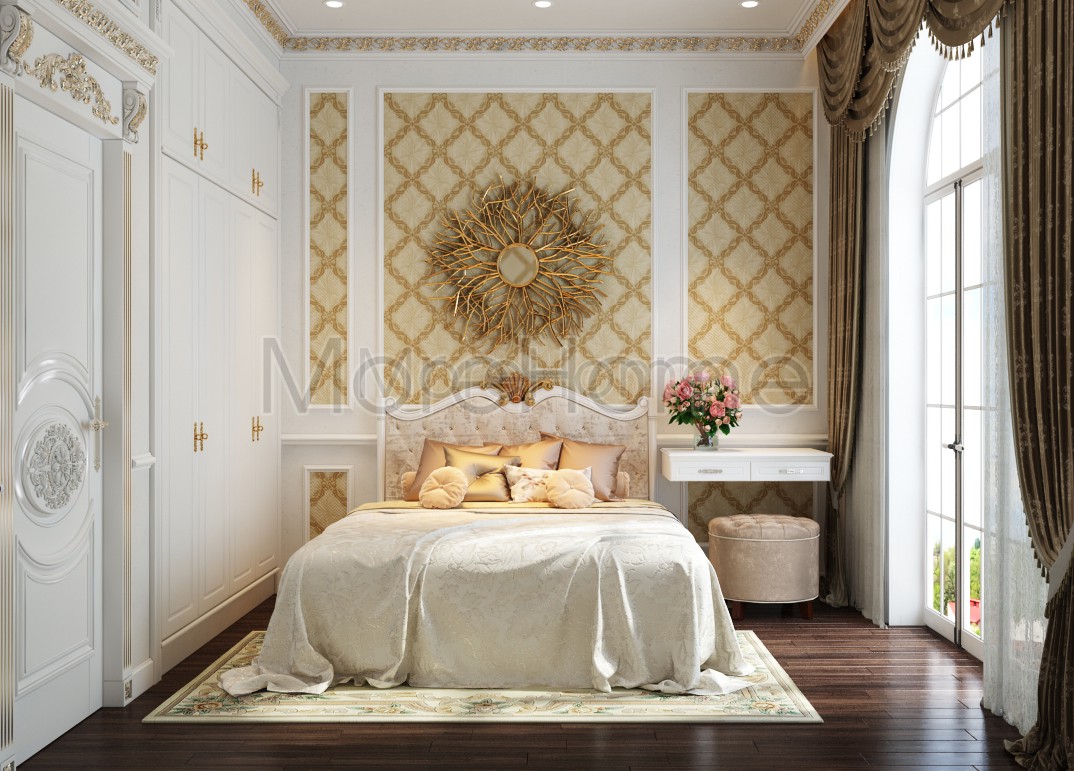 Thiết kế nội thất phòng ngủ tân cổ điển mang đến một không gian riêng tư sang trọng và thoải mái. Thiết kế không quá rộng, tủ gỗ và kệ đặt âm tường vừa tăng tính thẩm mỹ vừa tạo cảm giác cơi nới cho không gian. Các họa tiết trên tường lấy tone màu vàng ánh kim và trắng tạo sự thông suốt từ không gian sinh hoạt chung đến phòng ngủ. Ánh sáng tự nhiên được lấy từ mảng tường kính khác biệt là một điểm nhấn cho căn phòng.
