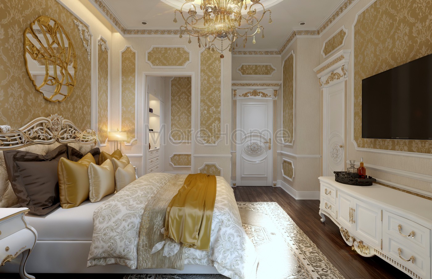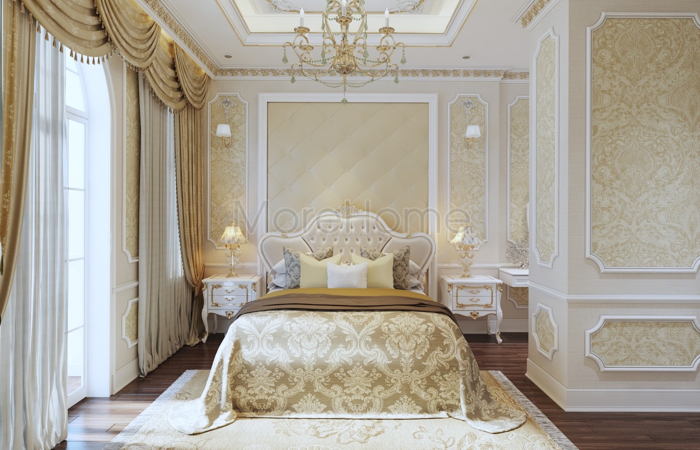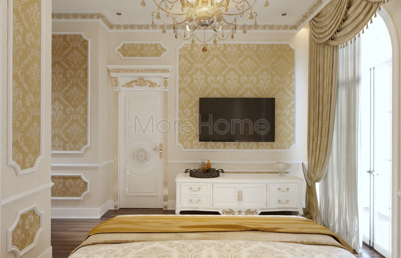 Thiết kế nội thất phòng ngủ tân cổ điển mang đến một không gian riêng tư sang trọng và thoải mái. Thiết kế không quá rộng, tủ gỗ và kệ đặt âm tường vừa tăng tính thẩm mỹ vừa tạo cảm giác cơi nới cho không gian. Các họa tiết trên tường lấy tone màu vàng ánh kim và trắng tạo sự thông suốt từ không gian sinh hoạt chung đến phòng ngủ. Ánh sáng tự nhiên được lấy từ mảng tường kính khác biệt là một điểm nhấn cho căn phòng.