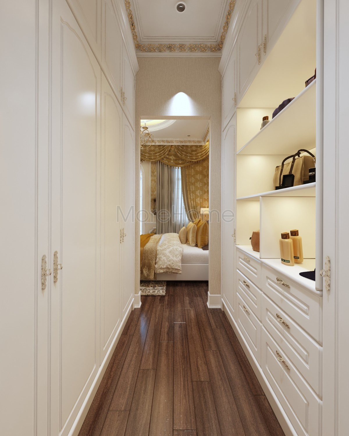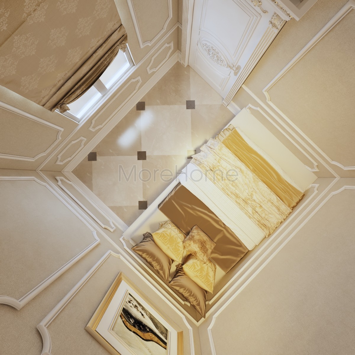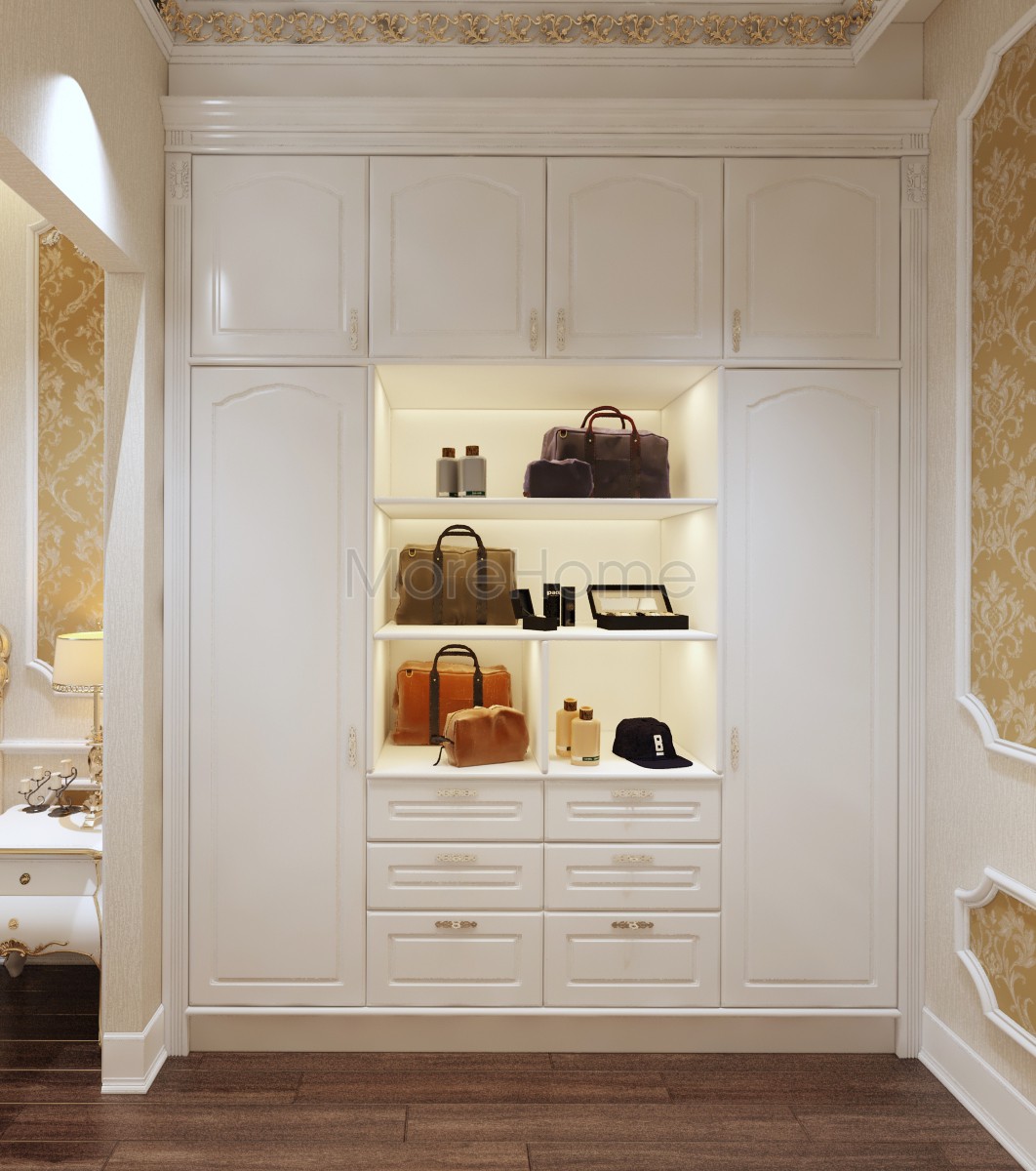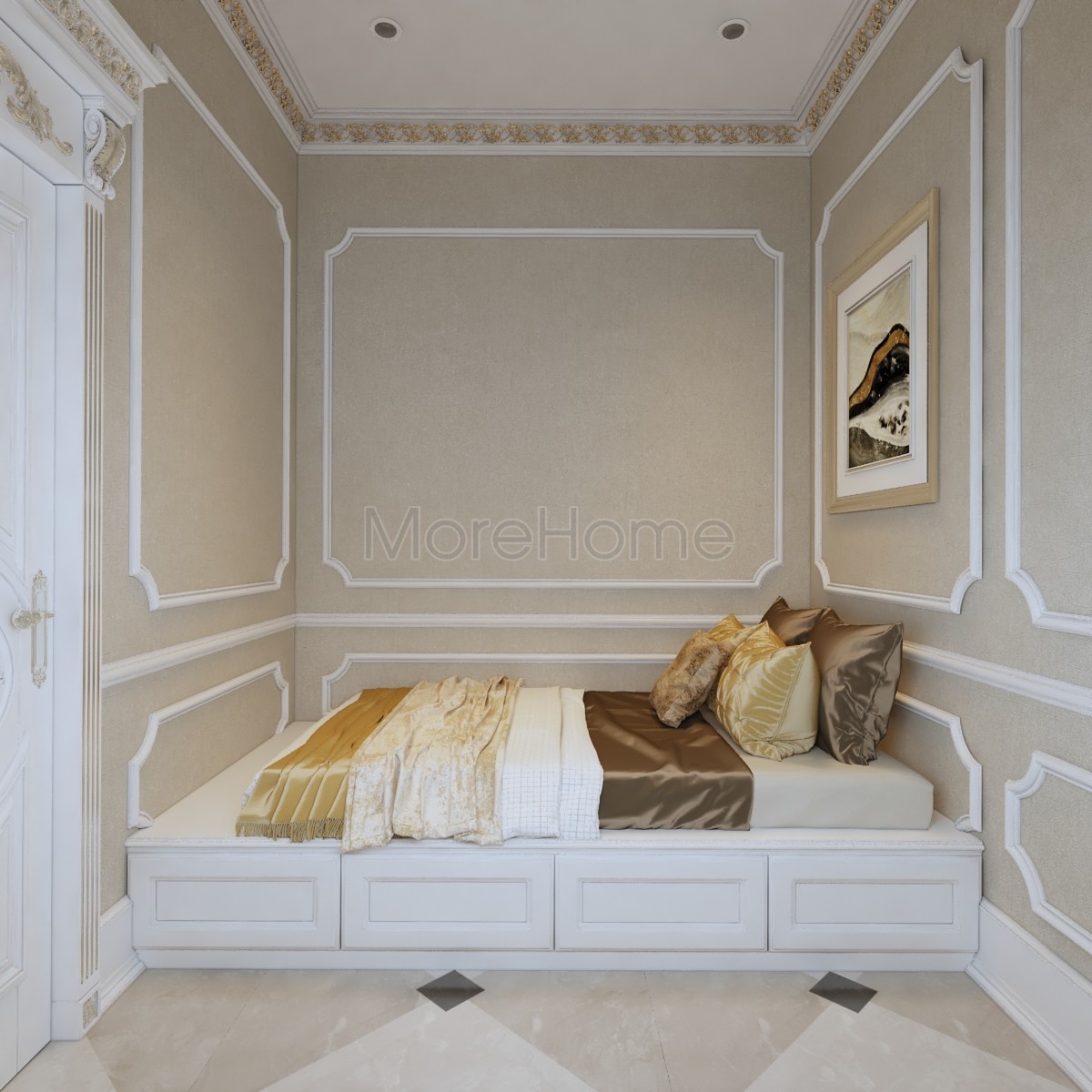 Thiết kế nội thất phòng ngủ tân cổ điển mang đến một không gian riêng tư sang trọng và thoải mái. Thiết kế không quá rộng, tủ gỗ và kệ đặt âm tường vừa tăng tính thẩm mỹ vừa tạo cảm giác cơi nới cho không gian. Các họa tiết trên tường lấy tone màu vàng ánh kim và trắng tạo sự thông suốt từ không gian sinh hoạt chung đến phòng ngủ. Ánh sáng tự nhiên được lấy từ mảng tường kính khác biệt là một điểm nhấn cho căn phòng.