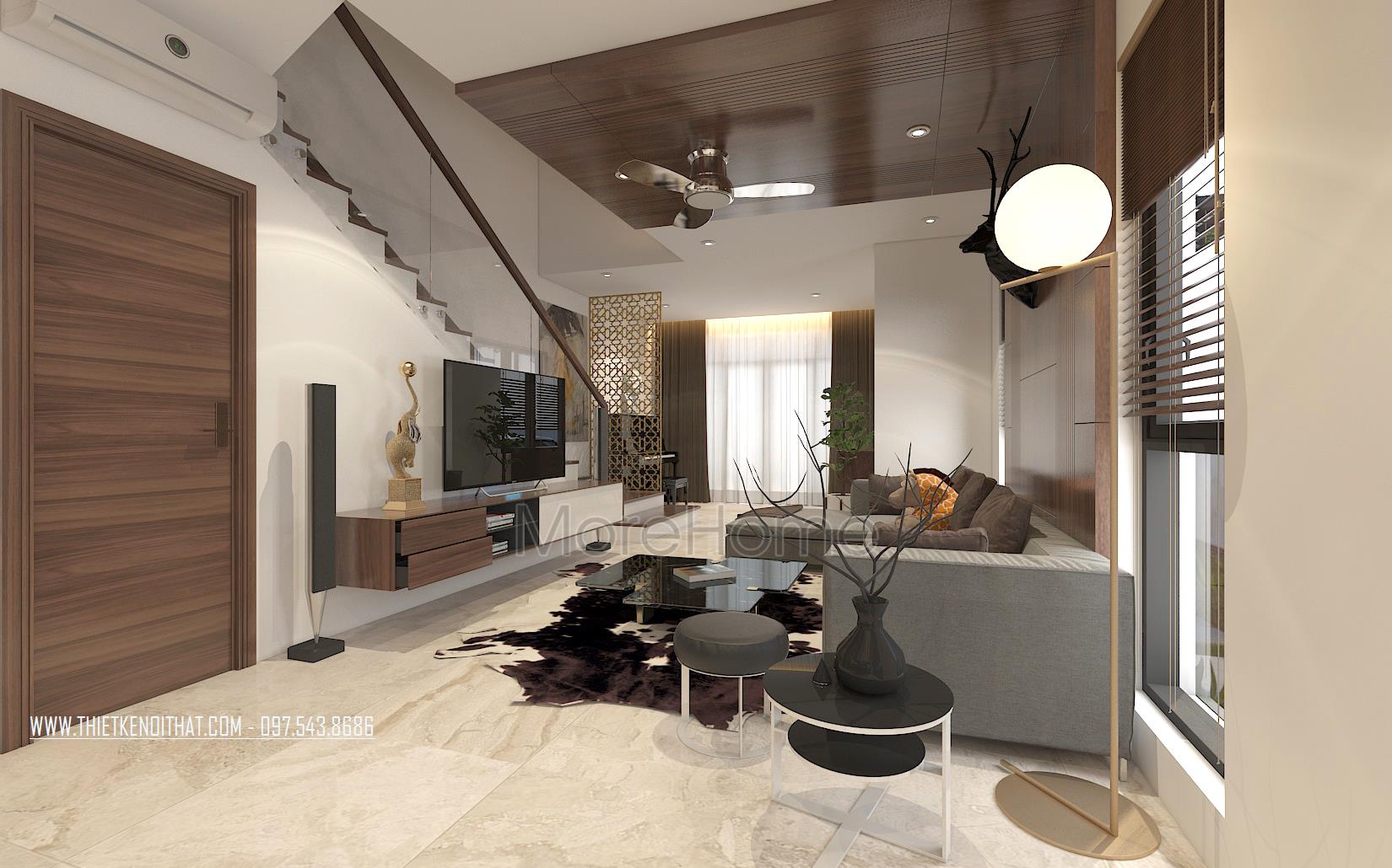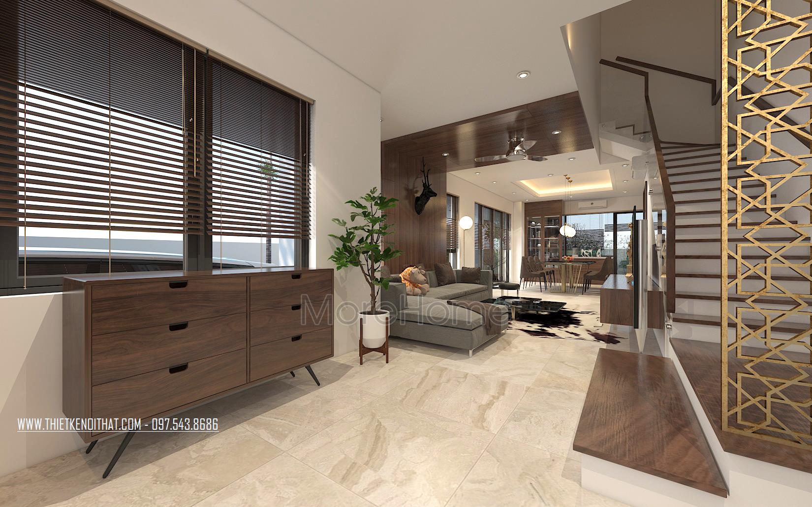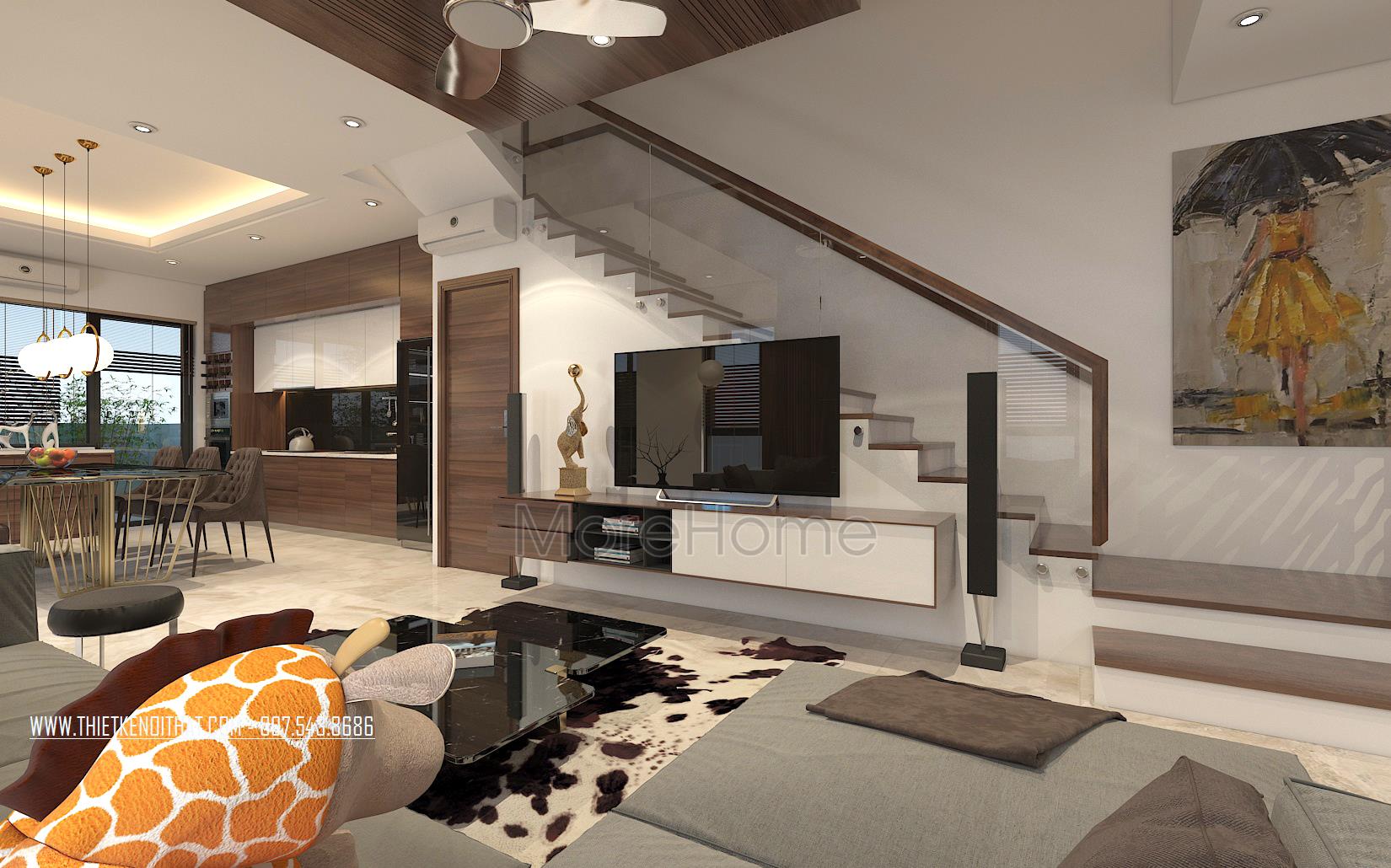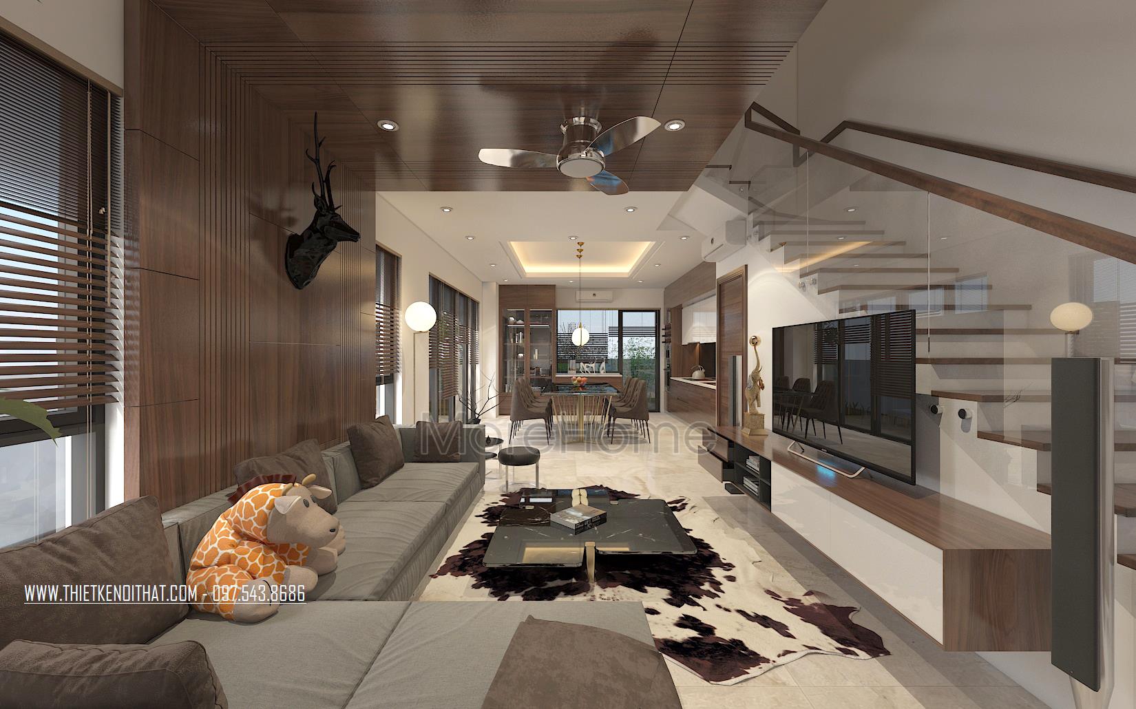 Thiết kế nội thất phòng khách phong cách tân cổ điển sử dụng tone màu nâu ấm áp làm làm chủ đạo, mang đến cảm giác ấm áp và dễ chịu cho gia chủ. Như đã đề cập, thiết kế mang phong cách hiện đại thường sử dụng các hình khối cơ bản, các đường nét rõ ràng, tránh xa các thiết kế trạm khắc hay thiên quá nhiều về trang trí và kiểu cách. Thiết kế ghế sofa dạng chữ L vừa khít không gian, gợi mở một không gian thiết kế nội thất gọn gàng, ngăn nắp. Các thiết kế tủ gỗ đơn giản, không cầu kỳ mà chỉ chú trọng sử dụng các khối hình đơn giản giúp gia chủ tiết kiệm tối đa diện tích sử dụng cho trang trí mà không làm ảnh hưởng đến tính thẩm mỹ của căn biệt thự.