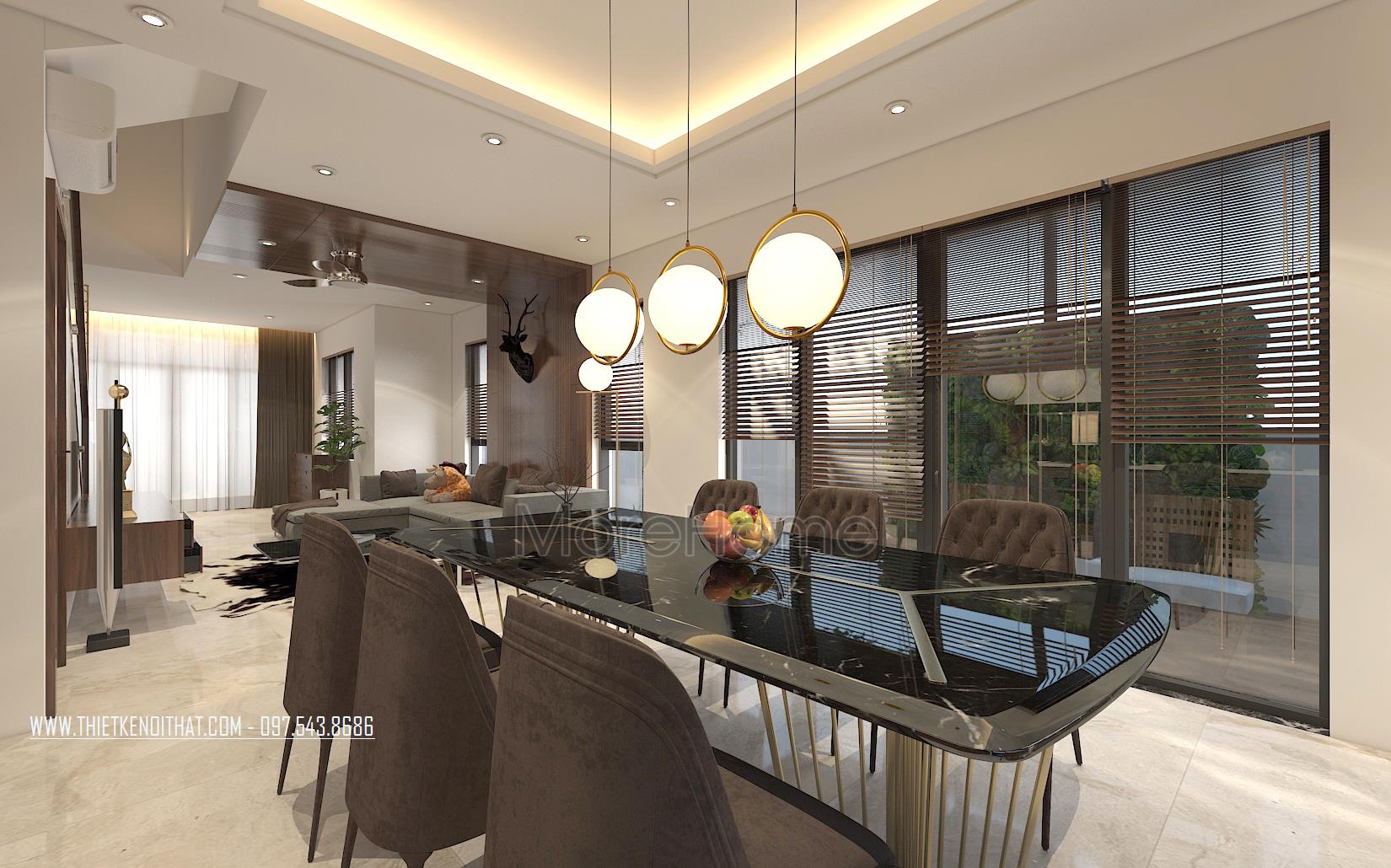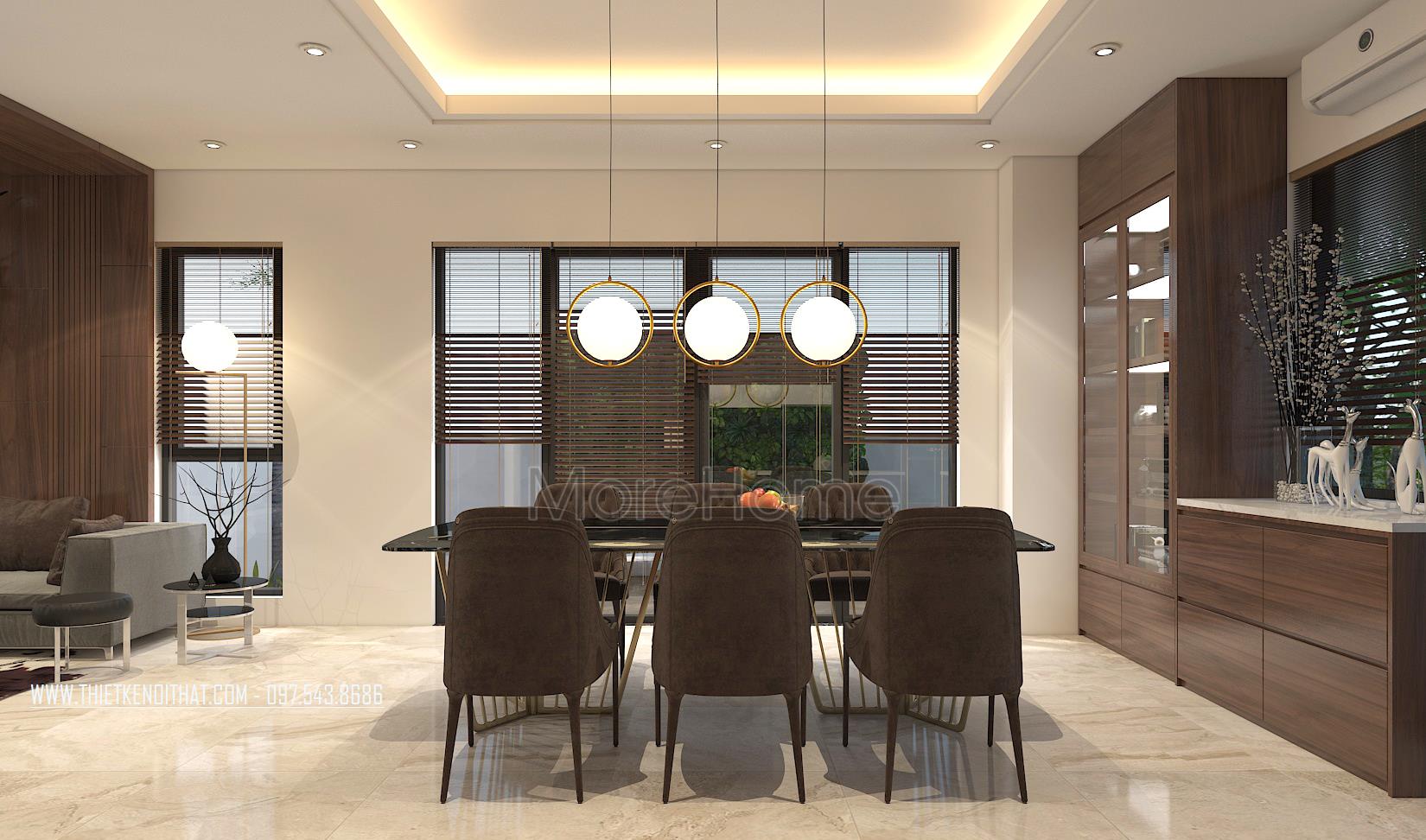 Bộ bàn ăn mà kiến trúc sư lựa chọn có thiết kế khá đơn giản, không tạo quá nhiều điểm nhấn về đường nét mà thay vào đó là sự linh hoạt trong chất liệu và màu sắc. Đá tự nhiên, và gỗ được kiến trúc sư sử dụng, màu sắc nâu ấm áp được ứng dụng giúp định hình phong cách thiết kế và phần nào tạo sự gắn kiến với thiết kế nội thất phòng khách. Diện tích bàn ăn khá rộng, phù hợp với nhiều mục đích sử dụng của gia chủ, không chỉ là các bữa ăn gia đình ấm cũng, mà còn là các bữa tiệc với bạn bè hay đại gia đình.