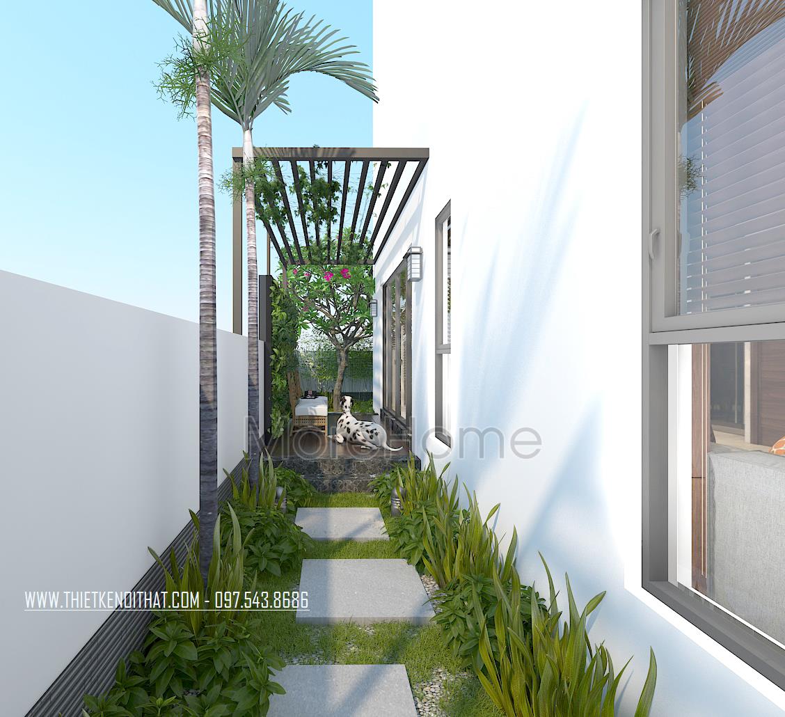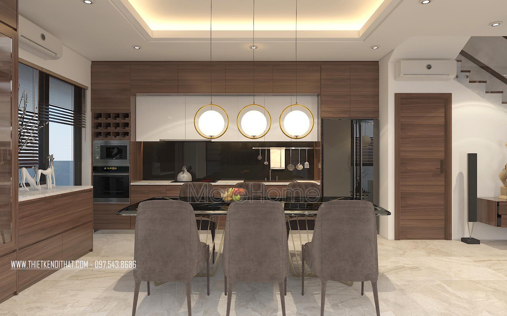 Không gian nội thất phòng bếp khá đơn giản, không đi sâu vào thiết kế chi tiết cầu kỳ mà đơn giản là các thiết kế tủ gỗ sắp xếp một cách hợp lý giúp nhấn mạnh tính công năng và mang đến một không gian gọn gàng cho gia chủ. Ánh sáng tự nhiên được lấy từ các khung cửa sổ rộng giúp gia chủ tiết kiệm được tối đa điện năng sử dụng và cũng tạo cho thiết kế không gian sinh hoạt chung cảm giác thoáng, mở rộng view, mang đến cảm giác cơi nới khá nhiều.