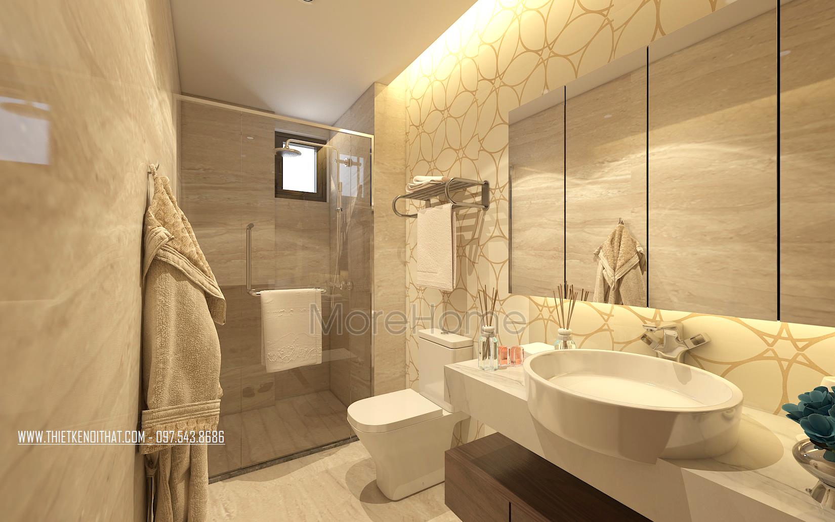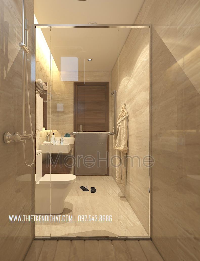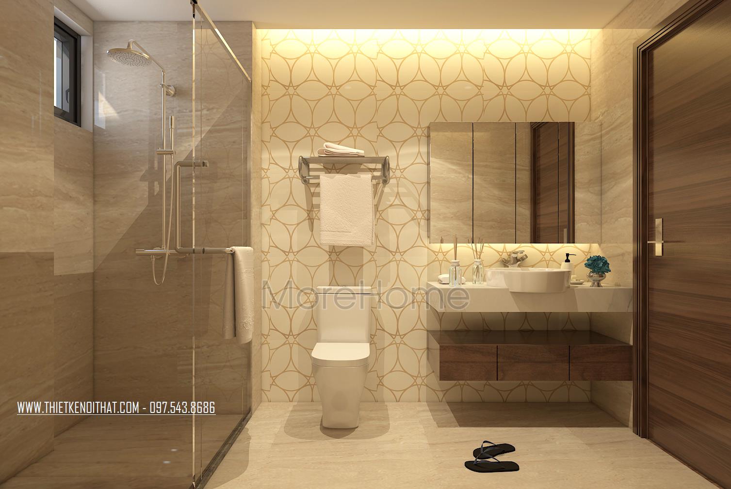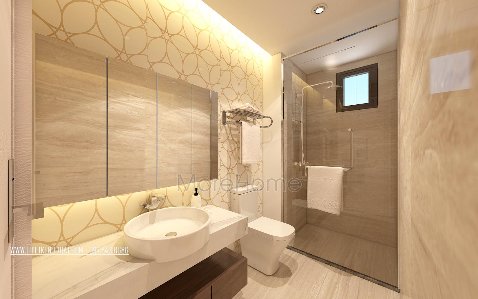 Cuối cùng là thiết kế nội thất phòng vệ sinh phong cách hiện đại. Các vật liệu nhẹ như kính cường lực, gương, hay đơn giản là các chi tiết mở rộng như thiết kế kết hợp tủ và kệ giúp tiết kiệm đáng kể diện tích sử dụng. Mặc dù đối với nhiều người, nhà vệ sinh là không gian khá đóng và hẹp, tuy nhiên, nhờ vào việc ứng dụng các vật liệu thiết kế mới, linh hoạt, điểm yếu về không gian được khắc phục đáng kể và giúp tạo cảm giác dễ chịu cho gia chủ.