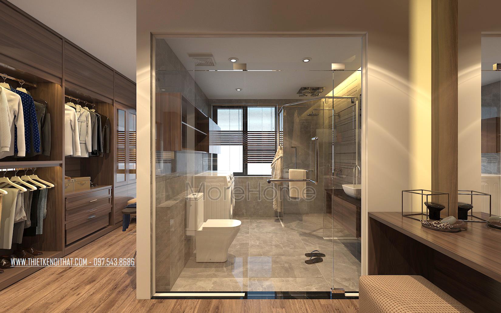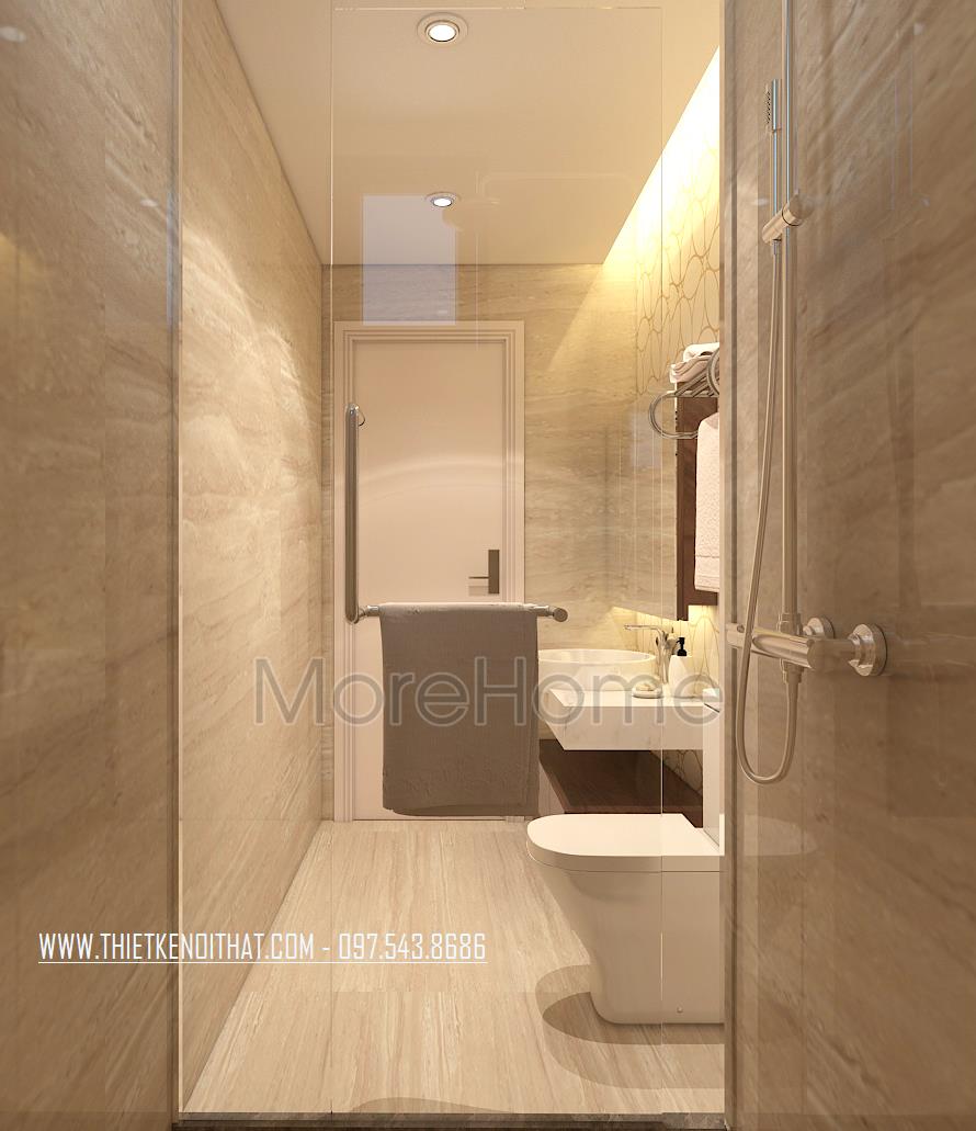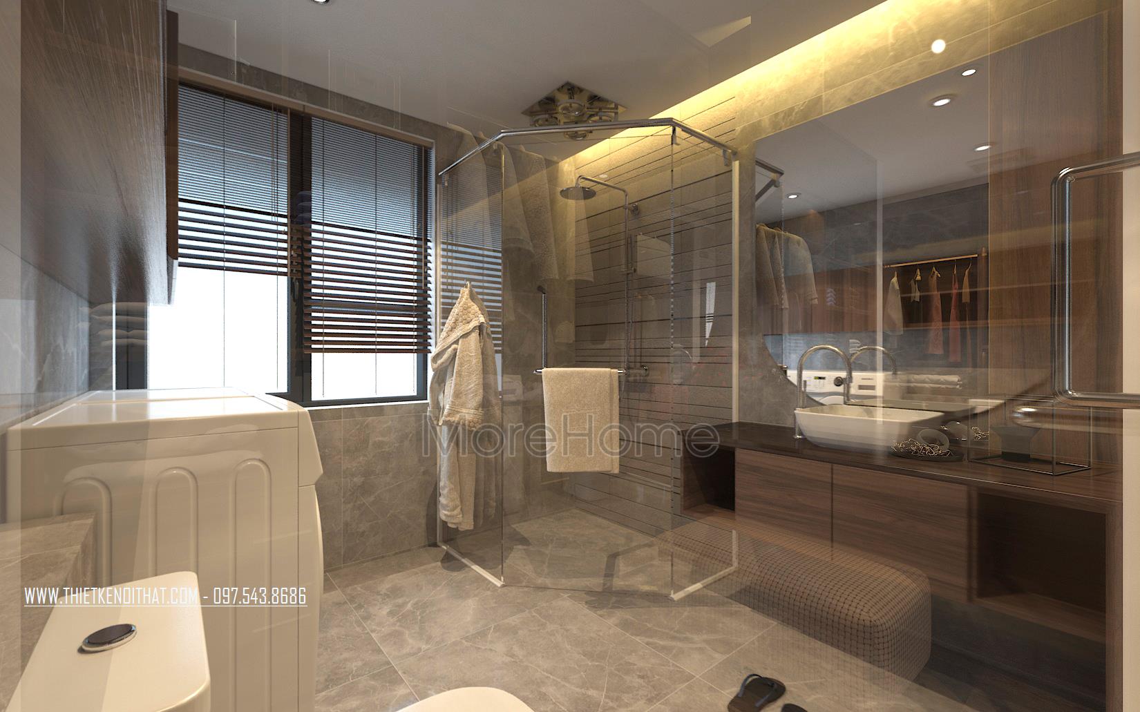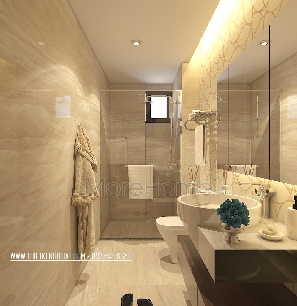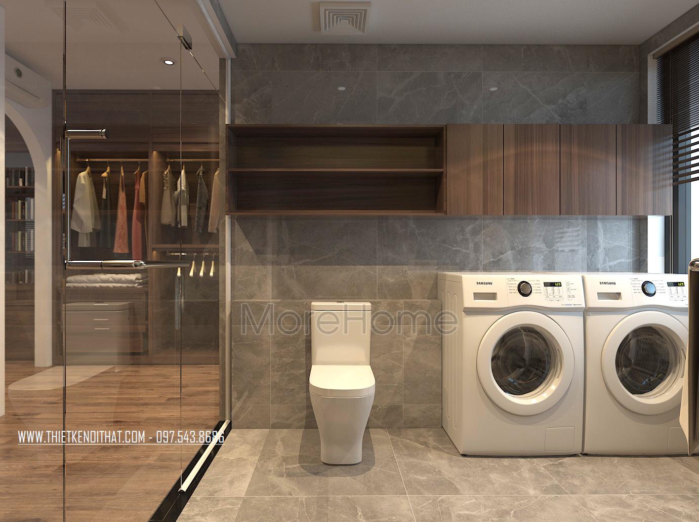 Cuối cùng là thiết kế nội thất phòng vệ sinh phong cách hiện đại. Các vật liệu nhẹ như kính cường lực, gương, hay đơn giản là các chi tiết mở rộng như thiết kế kết hợp tủ và kệ giúp tiết kiệm đáng kể diện tích sử dụng. Mặc dù đối với nhiều người, nhà vệ sinh là không gian khá đóng và hẹp, tuy nhiên, nhờ vào việc ứng dụng các vật liệu thiết kế mới, linh hoạt, điểm yếu về không gian được khắc phục đáng kể và giúp tạo cảm giác dễ chịu cho gia chủ.