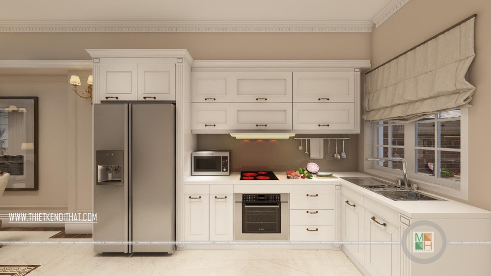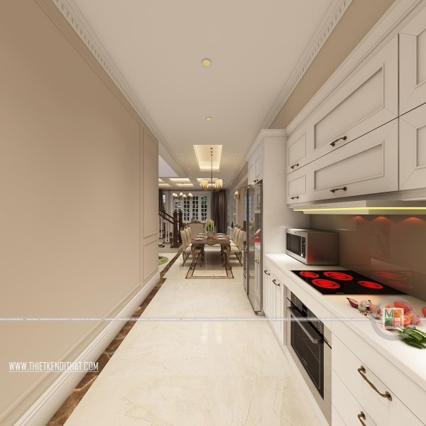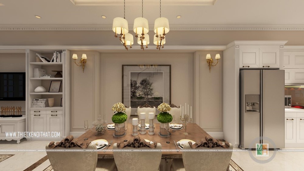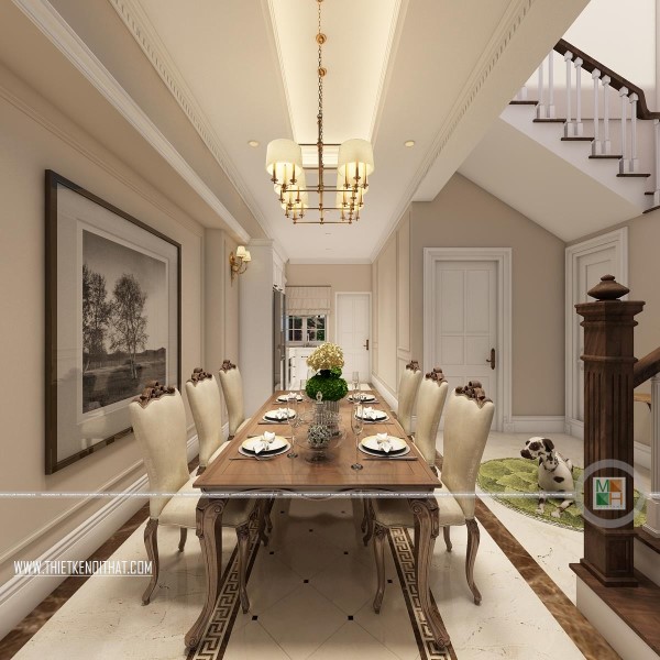Chính vì vậy, kiến trúc sư đã khéo léo sắp xếp cách không gian sinh hoạt chung này ở vị trí liền kề, không hề có vách ngăn.Thiết kế khu bếp đơn giản với hệ thống tủ bếp thiết kế tân cổ điển sang trọng. Ánh sáng mặt trời được tận dụng mang đến sức sống cho căn phòng. Thiết kế bàn ăn tạo điểm nhấn ở các đường trạm trổ và trang trí tinh xảo đem lại sự quý phái và tinh tế cho căn phòng, đồng thời góp phần định hình phong cách thiết kế tân cổ điển ngay từ đầu.