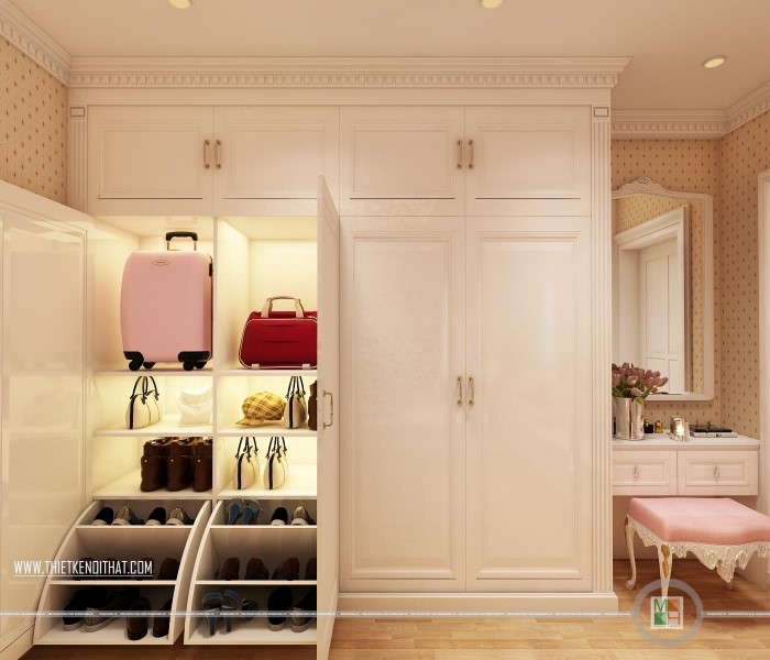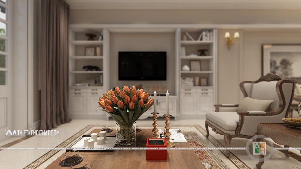 Tuy nhiên, thay vì lấy điểm nhấn là ánh sáng, và cảm giác tươi mới, kiến trúc sư lại khéo léo chuyển hướng sự chú ý của gia chủ đến đường nét và cảm giác ấm áp và căn nhà đem lại. Ngoài ra, thiết kế tủ đứng đường như đồng nhất với tường vừa đảm bảo tính công năng của đảm bảo tính thẩm mỹ và phần nào giúp mở rộng không gian. Thiết kế tường bao quanh sử dụng các trang trí nhẹ nhàng để tránh gây cảm giác nhàm chán và thể hiện đồng bộ nét cổ điển của cả căn nhà. Sự kết hợp của đường nét trên các thiết kế tủ gỗ, kệ, tường hay sofa tuy đều là những chi tiết thiết kế tạo điểm nhấn và khắc họa rõ ràng phong cách tân cổ điển.