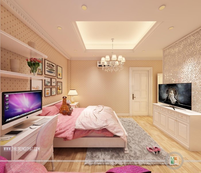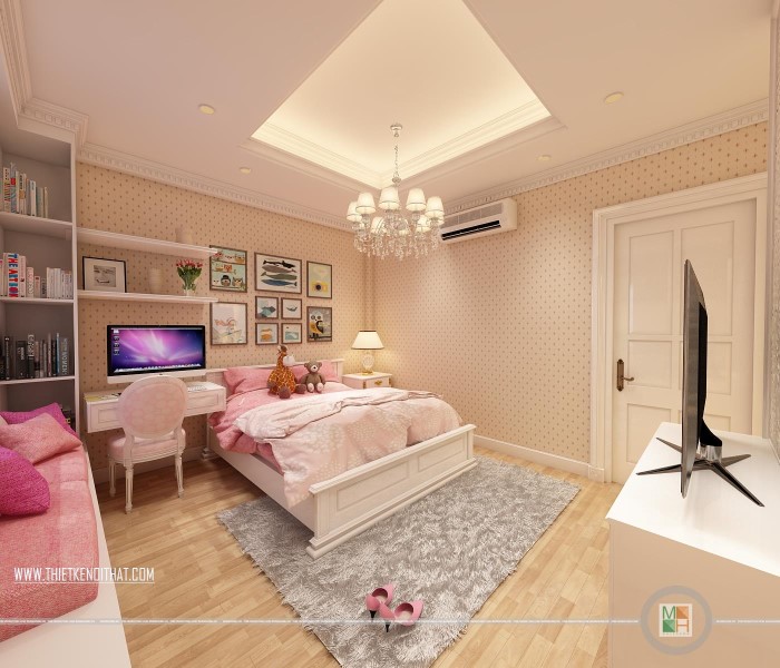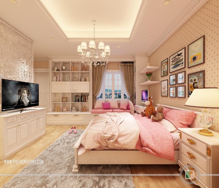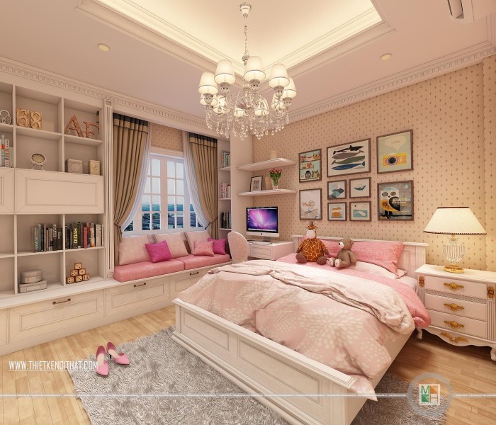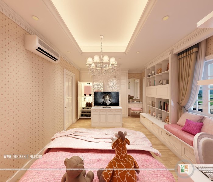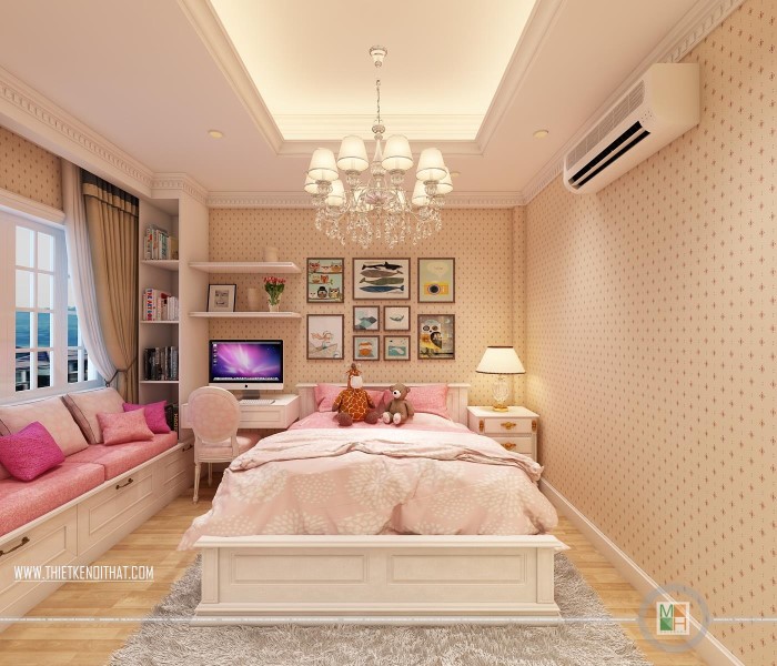 Thiết kế phòng ngủ sử dụng tông màu “hồng ngọt” là biểu tượng của sự hồn nhiên, nhẹ nhàng và vui vẻ. Thiết kế ghế tựa đa năng được đặt ở vị trí hướng sáng thuận tiện cho sinh hoạt và khơi gợi cảm hứng đọc, khám phá. Thay vì sử dụng màu sơn đơn sắc ở các bức tường, tác giả sư dụng giấy dán tường để tránh cảm giác đơn điệu cho căn phòng. Kệ tủ được thiết kế hợp lý tăng tính công năng và là điểm nhấn nội thất cho căn phòng. Bên cạnh đó, thiết kế vách ngăn gỗ độc đáo nhẹ nhàng phân chia phòng ngủ thành hai không gian nhỏ rất tiện lợi và thoải mái.