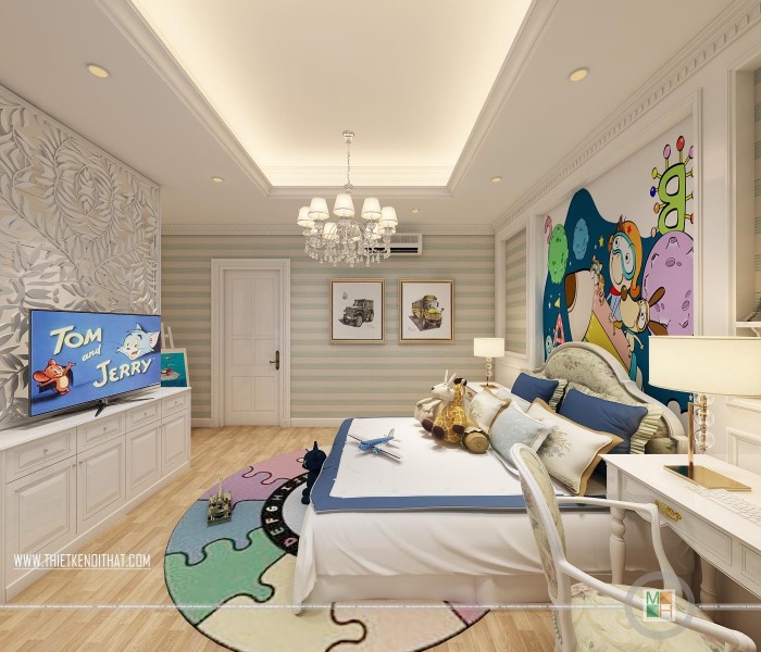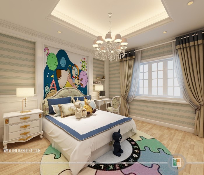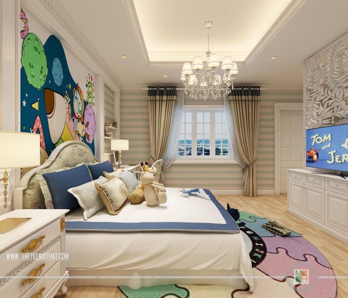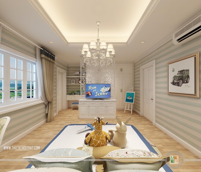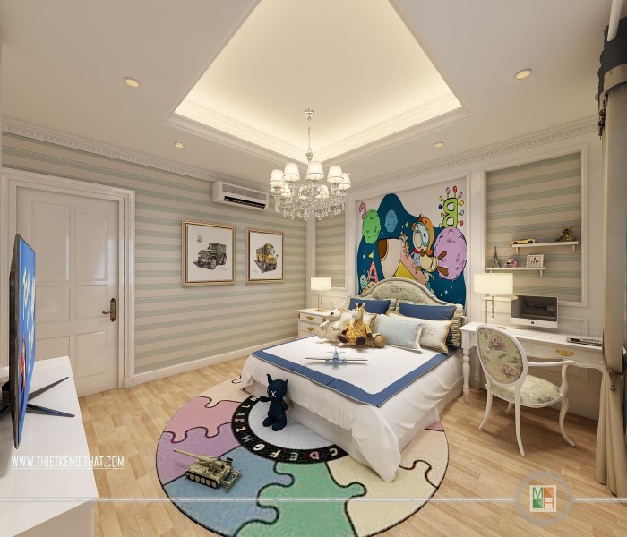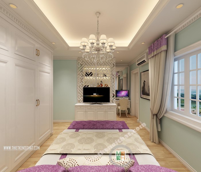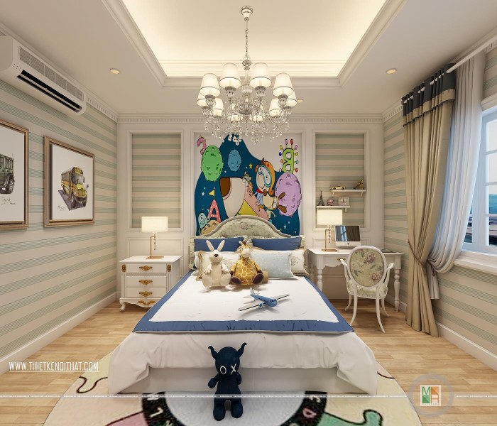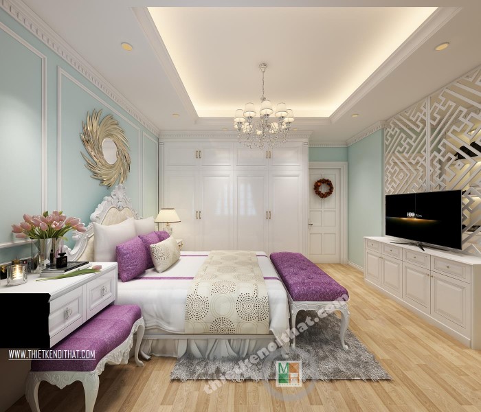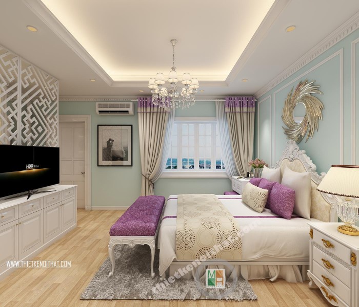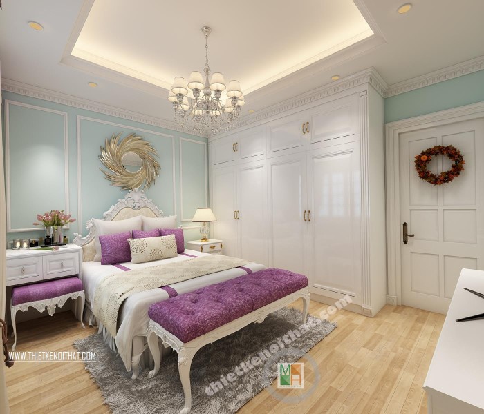 Thiết kế phòng ngủ tiếp theo được thiết kế tương tự với tông màu xanh là điểm nhấn. Các thiết kế trạm khắc và trang trí trên các vật dụng toát lên vẻ đẹp tân cổ điển đầy thu hút.Thiết kế đối xứng lấy giường ngủ làm trung tâm tạo cảm giác hài hòa và đồng điệu cho căn phòng.