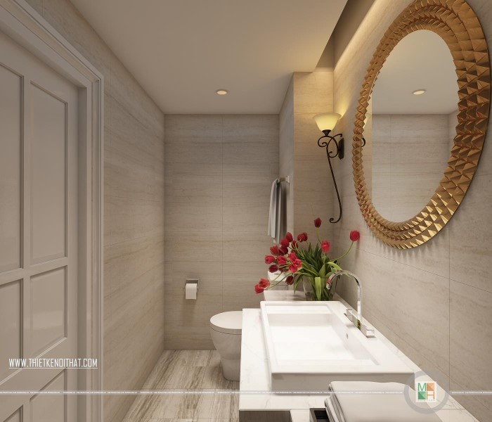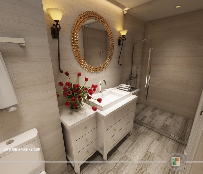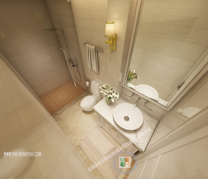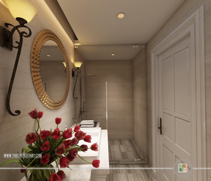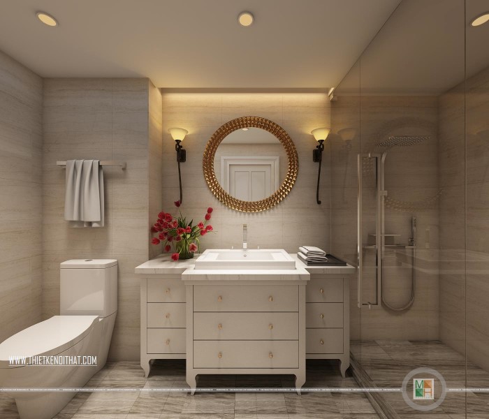 Thiết kế phòng tắm sử dụng kính làm vật liệu chủ yếu giúp không gian trở nên sáng và mở hơn nhiều. Bên cạnh đó, các đồ dùng được thiết kế với tông màu trắng nhẹ nhàng tạo hiệu ứng phản chiếu và kết hợp hài hòa với ánh sáng đem lại sự sang trọng và toát lên sự quyến rũ cho căn phòng.