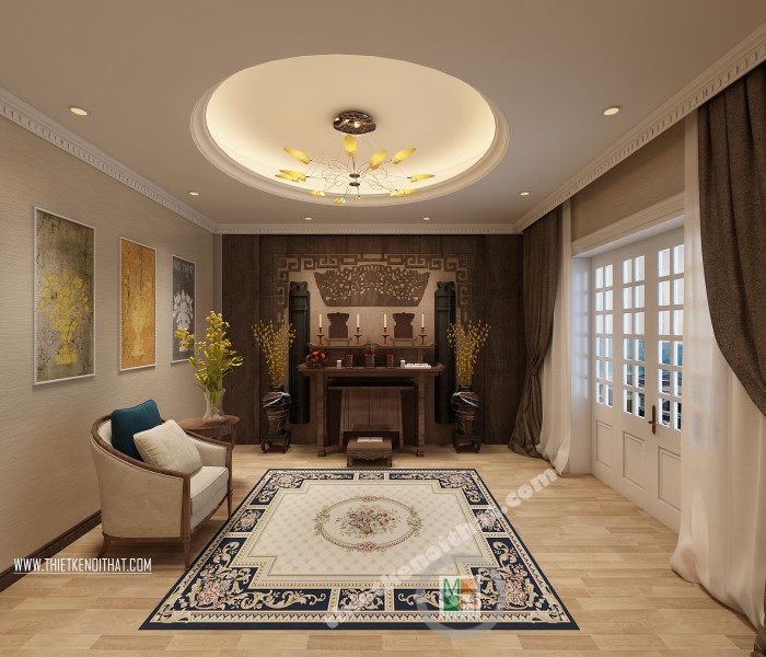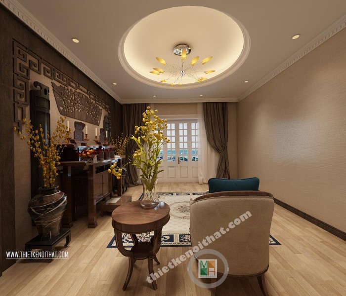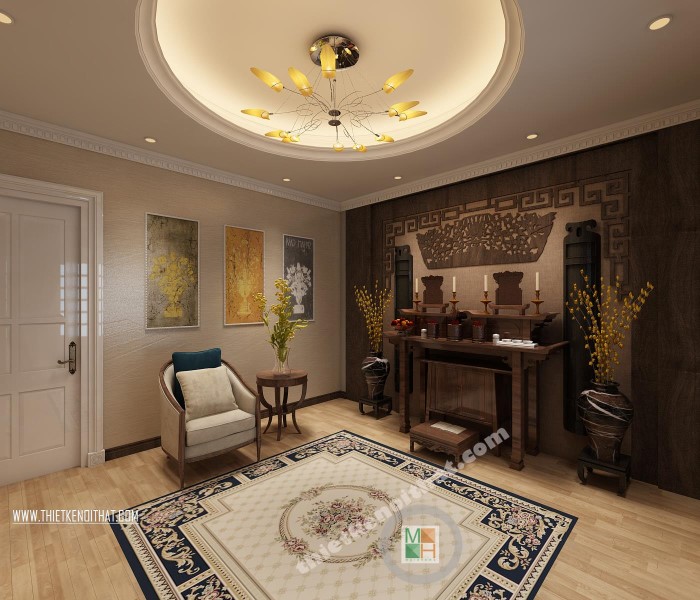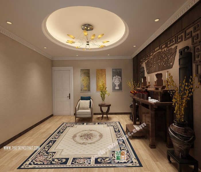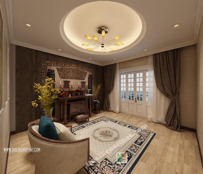 Thiết kế không gian tâm linh mang đến cho gia chủ cảm giác thư thái trong tâm hồn. Thiết kế đơn giản không quá nhiều chi tiết, điểm nhấn chính là góc thờ cúng linh thiêng. Bên cạnh đó kiến trucs sư cũng sử dụng một vài điểm nhấn trang trí với màu sắc tạo cảm giác hài hòa và đồng bộ cho căn phòng.