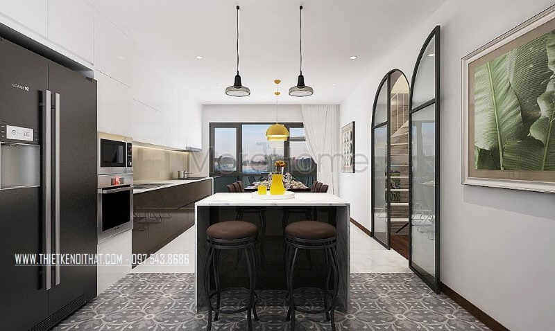 Bàn đảo bếp hiện đại sử dụng đá ốp vân mây tuyệt đẹp cùng 2 chiếc ghế đơn đẹp mắt giúp bạn có thể làm mọi thứ hữu ích cùng với đó vị trí bố trí cạnh tủ lạnh giúp bạn thuận tiện cho việc nấu ăn.