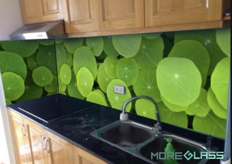 Khi sử dụng mẫu kính ốp 3D hình là xanh tràn sức sống, căn bếp sẽ trở nên sinh động hơn.