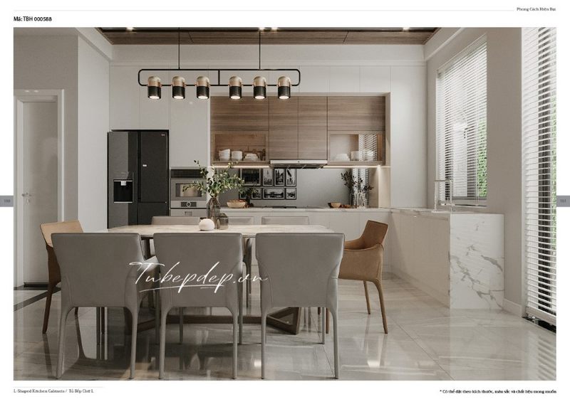 Bên cạnh đó, sự kết hợp giữa các loại vật liệu cũng được xem là một phong cách đáng chú ý trong thiết kế bếp hiện đại. Sự pha trộn giữa gỗ tự nhiên và đá ốp mặt bàn tạo nên nét hài hòa thú vị, mang lại cảm giác gần gũi đồng thời vẫn giữ được sự tinh tế cho không gian sống. Xu hướng này không chỉ đề cao tính ứng dụng mà còn thể hiện cá tính riêng của gia chủ qua việc lựa chọn chất liệu và màu sắc tương đồng để tạo sự thống nhất trong tổng thể thiết kế.
