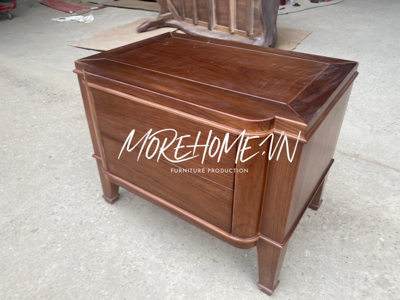 Việc thi công một tab đầu giường gỗ tự nhiên với chân hiện đại tô điểm làm nổi bật vẻ đẹp thẩm mỹ của không gian.